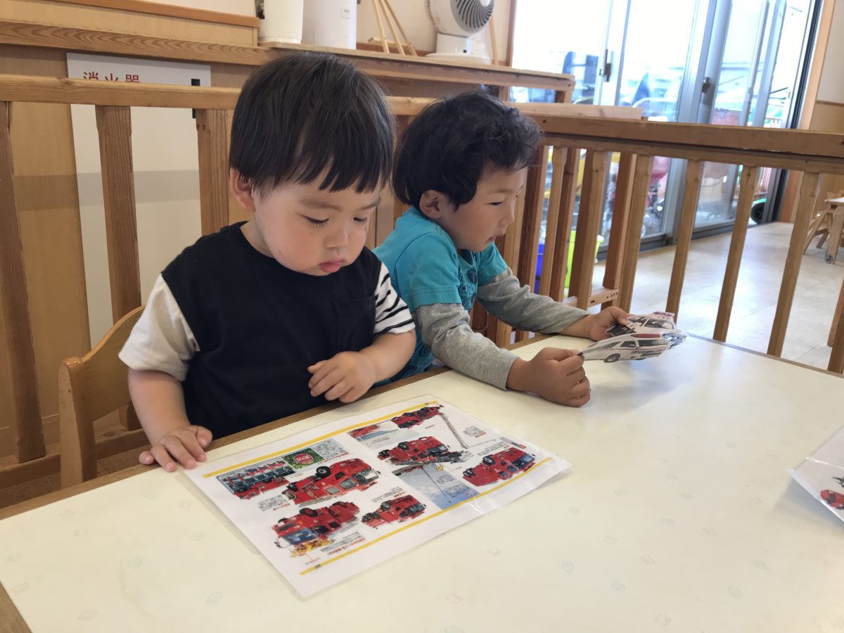 テラスで「はたらくくるま」の音楽を聴いて「ショベルカー!」「クレーン車!」と声に出していたお友だち。お部屋に置いてある、はたらくくるまの写真に気が付き椅子に座ると、「これしょうぼうしゃ!」「これははしごしゃ!」と知っている車を指さして次々に名前を言っていました。カードで遊んでいたお友だちは、自分の手元にカードを集めると、一枚ずつ机に出し「これなんだ!」「バイク!」とお友だち同士でクイズを出し合い、難しい乗り物が出てくると「なんだろ?」「くるまかな?」と知っている乗り物の名前を出して楽しんでいる姿がありました。