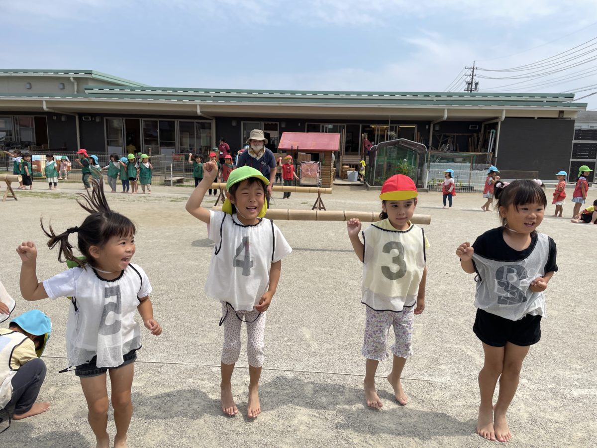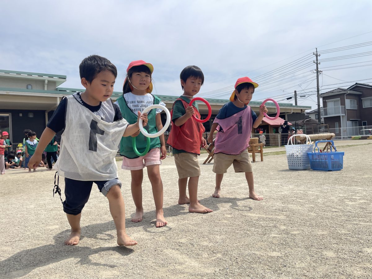 先週、見つけたダンゴムシ。子どもたちが不意に「そういえばこのまえみつけただんごむしっていきてるんかな?」と思い出して気になりだし、ケースを見てみると「わっ!だんごむしうごいたー!」「いきてる!!おやすみのひがあったけど、いきてるー」「すごいね!!」とダンゴムシの生命力に子どもたちも驚いていたようです。「そういえばあかちゃんだんごむしはいるのかな?」と先週生まれたばかりのダンゴムシはどこへ行ってしまったのか分からなかったようですが、「おおきくなってるといいね!」」と話していた子どもたちでした。園庭では、運動会ごっこをし元気よく音楽に踊り始めると「きょう、ホワイトチームでだれがいちばんたかくジャンプできるかきょうそうしよ!」とダンスの振り付けのジャンプを誰が1番高くできるか競争が始まり「めろんぐみさんよりたかくジャンプするぞー!」と楽しそうに踊っていました。そしてリレーでは「1ばん、ぼくもはしる。めろんぐみさんにかてるかな?」とばなな組さんが1番のトップバッターを走りました。「ぼく、もうすこしでめろんさんとおなじくらいではしれそうやった」と少しスピードで負けてしまったようでしたが、「つぎはもっとがんばりたい!」とやる気につながっているようでした。めろんぐみさんが使った鳴子を片付けていると「これぼくもいっしょにかたづけてもいい?」とさくらんぼ組のお友だちもお手伝い。「こうやっていれるの?」とめろん組さんに確認しながら楽しそうにお手伝いをする姿がありました。ビブスを畳んだり太鼓や鳴子の片づけを手伝ったりとみんなで協力する姿がいろんなところで見られることが増えてきました。