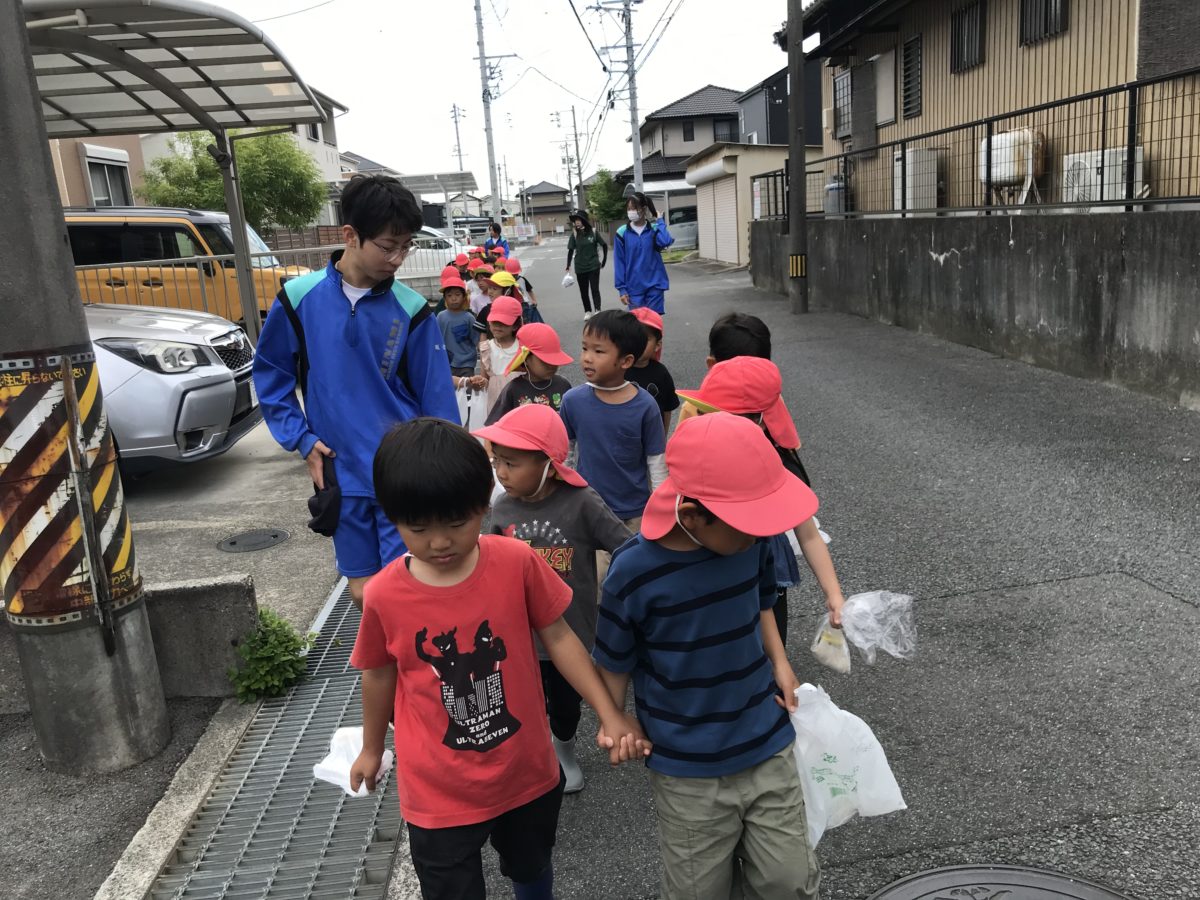 めろん組のお友だちは以前から楽しみにしていたじゃがいも掘りへ職場体験で南中学校から来ているお兄さん、お姉さんと一緒に出かけました。道中では「どこからきたんー?」「みなみちゅうがっこうしっとる!」とお兄さん、お姉さんに質問をして会話を楽しむ姿があったり「ここにおはなさいとったのにないねー」「ここ○○くんのいえやー!」「じゃがいもほりってどこでするんやろー」と手を繋いでいるお友だちと会話を弾ませたりとウキウキな気持ちで向かう様子がありました。じゃがいも掘りの場所に到着すると「ここじゃない!」「じゃがいもってどれやろ?」と大きな畑の色々な種類の葉っぱをみて観察していました。「ここにあるんかな・・?」「どうやってやるん?」と始めはそーっと土を掘ったりツルを引っ張ったりしていましたが、じゃがいもが出てくると「おっきい!」「こっちにもうまってそう!」と元気よく掘る姿がありました。また「これおっきくてとれやん・・」と困っていると「てつだったろか?」と一緒に掘ってあげる優しい姿もみられました。