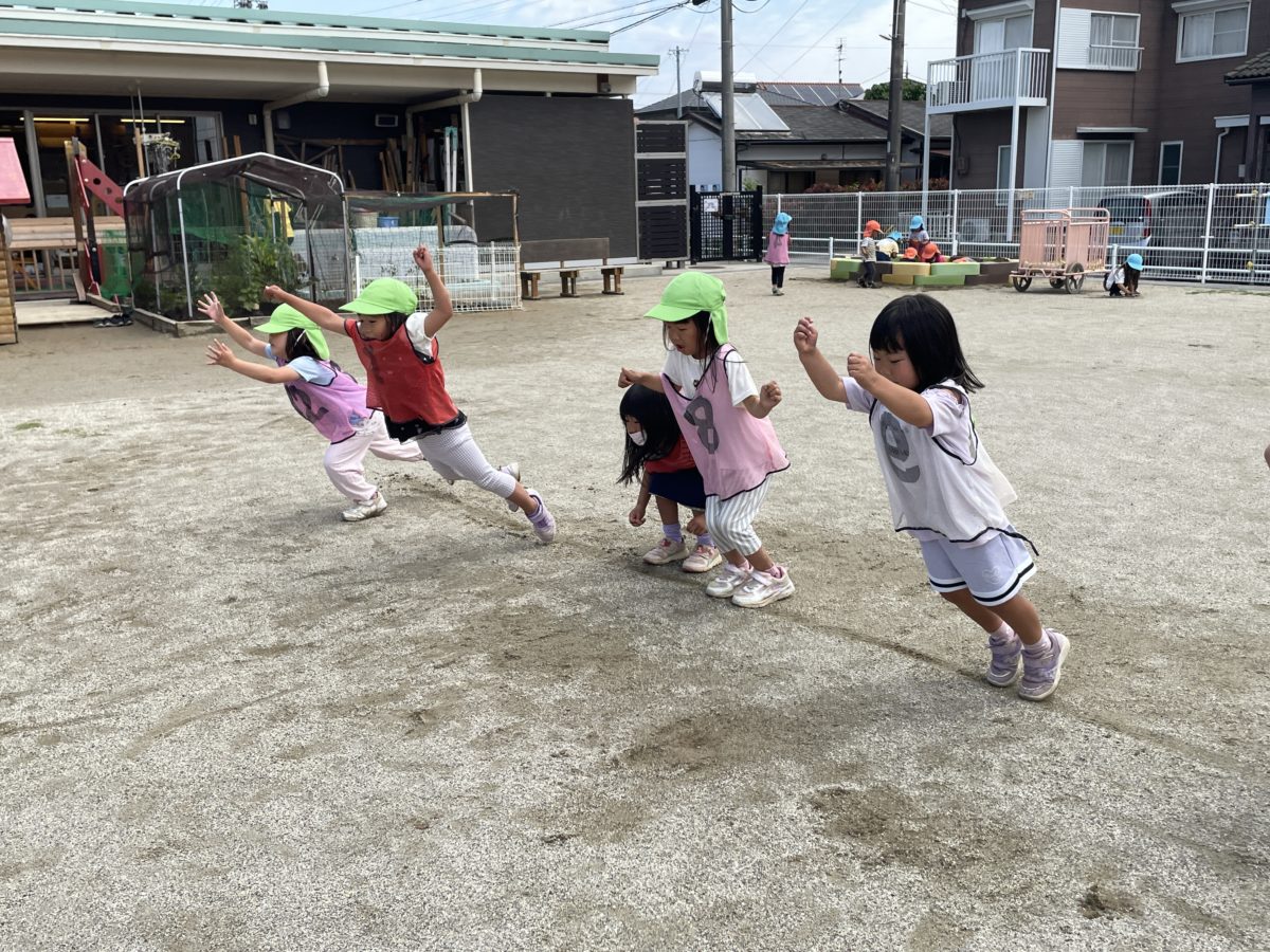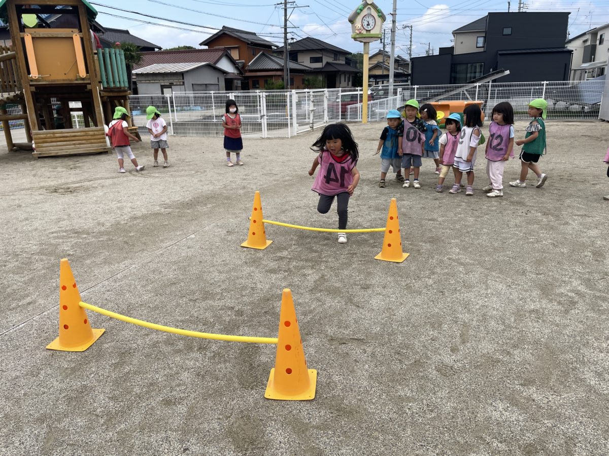 園庭では、ジャンプ対決で盛り上がっている様子。「だれがいちばんとおくにとべるかなー?」「いちばんになる!」と何度も挑戦していました。ジャンプ飛びに夢中になっていたのでハードルを置いてみると「これやりたい!」「これたかいやつでとべるよ!」と一番高いのを跳んだり、遠くへ跳んだりとお友だちの記録を超えようと繰り返し挑戦して頑張っている姿がありました。