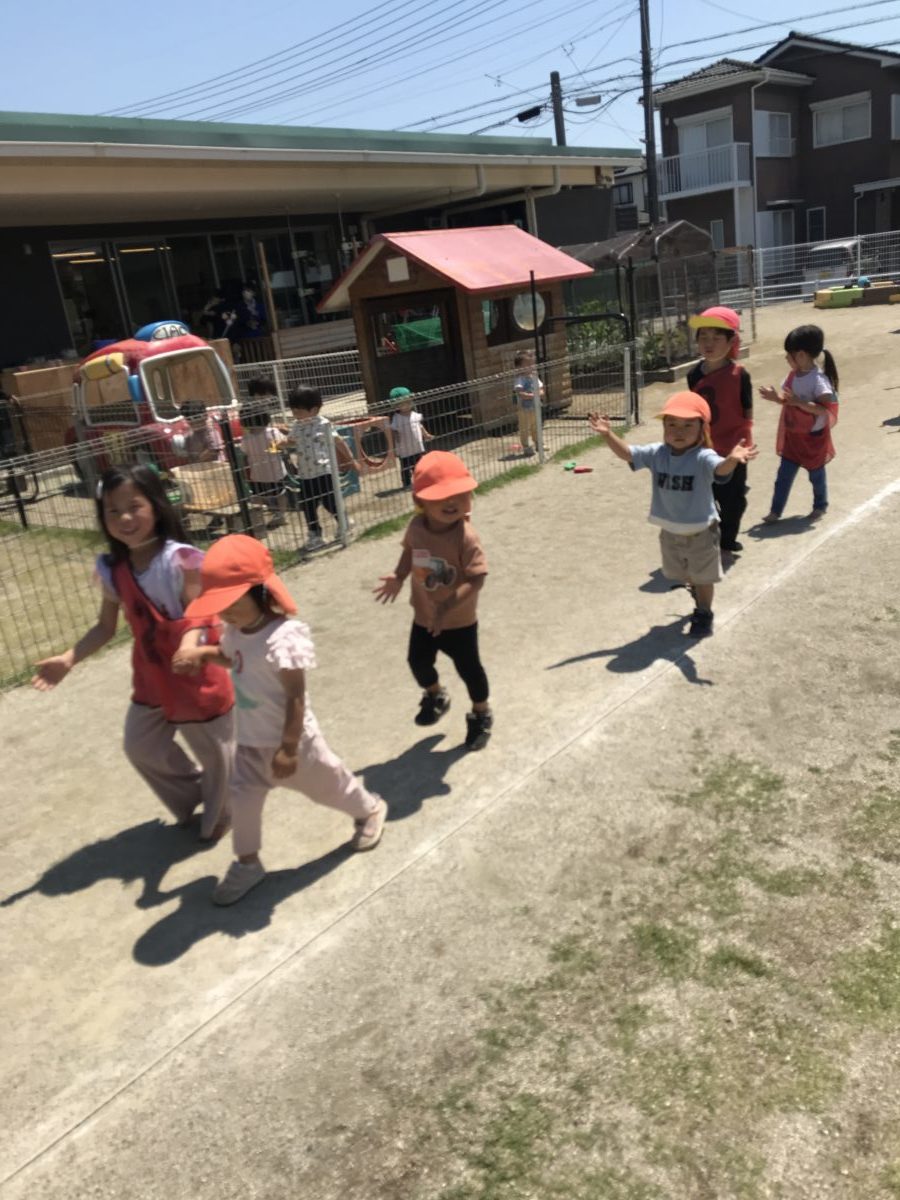 お外でお兄ちゃん達のダンスを見て、手拍子したり体を動かして踊っていたので、大きい園庭に出てお兄ちゃん達の輪に入れてもらいました。音楽が鳴ると、一緒になって踊りだし、お隣のお姉ちゃんが移動するのを見てついていったり、時々手を引いて連れて行ってくれるので嬉しそうにしていました。太鼓の準備が始まり、ばちを持って一人が叩き出すと一人二人と持ちだし、「こうやってするんだよ」とお兄ちゃんが教えてくれるのを真似しながら叩いていました。楽しかったね。いっぱい遊んだ後は、お茶を飲んでゆっくりして休憩を取りました。