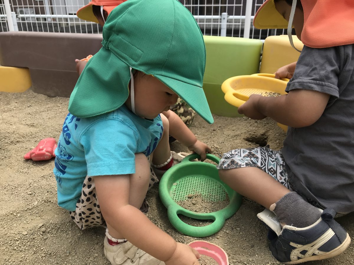 砂場で遊んでいたお友だちは、カップやふるいを持ちカップに砂をいっぱい入れてみたり、カップからふるいに入れて砂をサラサラにしてみたりとおもちゃを使ってケーキやお団子を作ってお友だちと「どーぞ!」「これあげる~!」とやり取りを楽しんでいました。