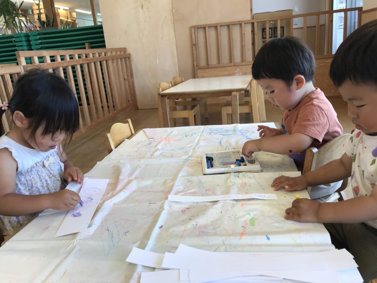 お部屋でお絵描きをしていたお友だちは、紙にいっぱいの線を描くと、「これみて~!」「ここに描く!」と思い思いの線を描いていました。線を描き終えると紙をクルクルと巻いて望遠鏡のように覗き、お部屋をぐるっと一周していました。