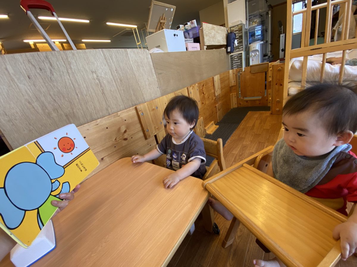 すいか組のお部屋では、絵本を見入っている姿が。次々と出てくる動物のイラストを見て「あ!」と声を上げて次は何かな?と楽しんでいるようでした。