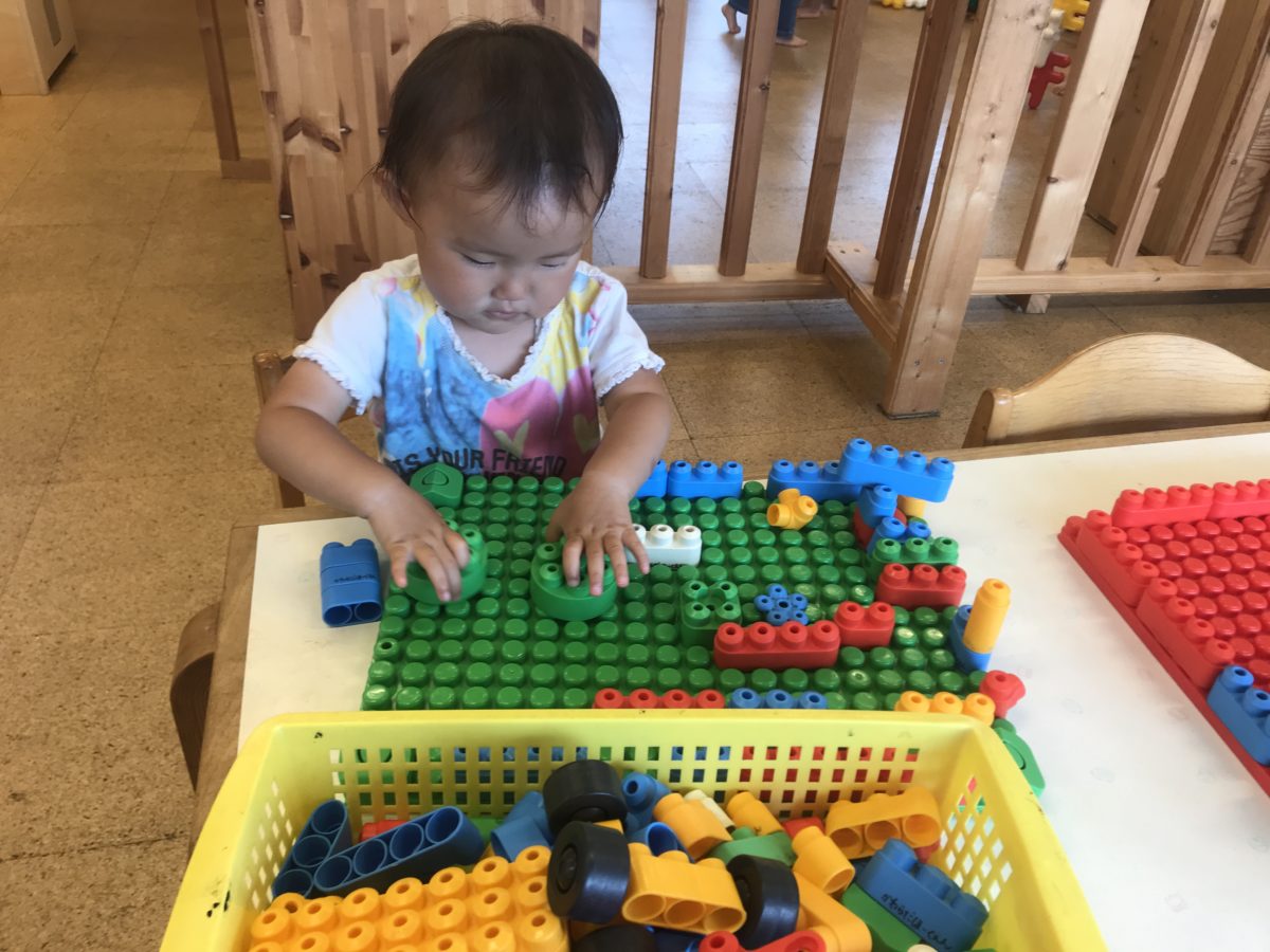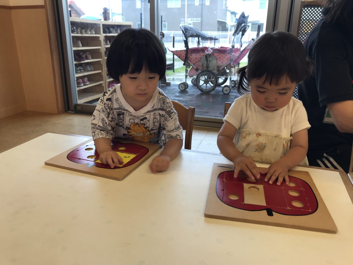 お部屋で遊んでいたお友だちは、りんごのパズルをしていました。パズルの向きを色々な方向に変えてどこにハマるかな~?と考え、完成すると「できた~!」と喜んでいました。ブロックをしていたお友だちは、土台の上に丸のブロックを置き、上からギューギュー!と押さえてブロックをはめ色んな形のブロックを集めていました。