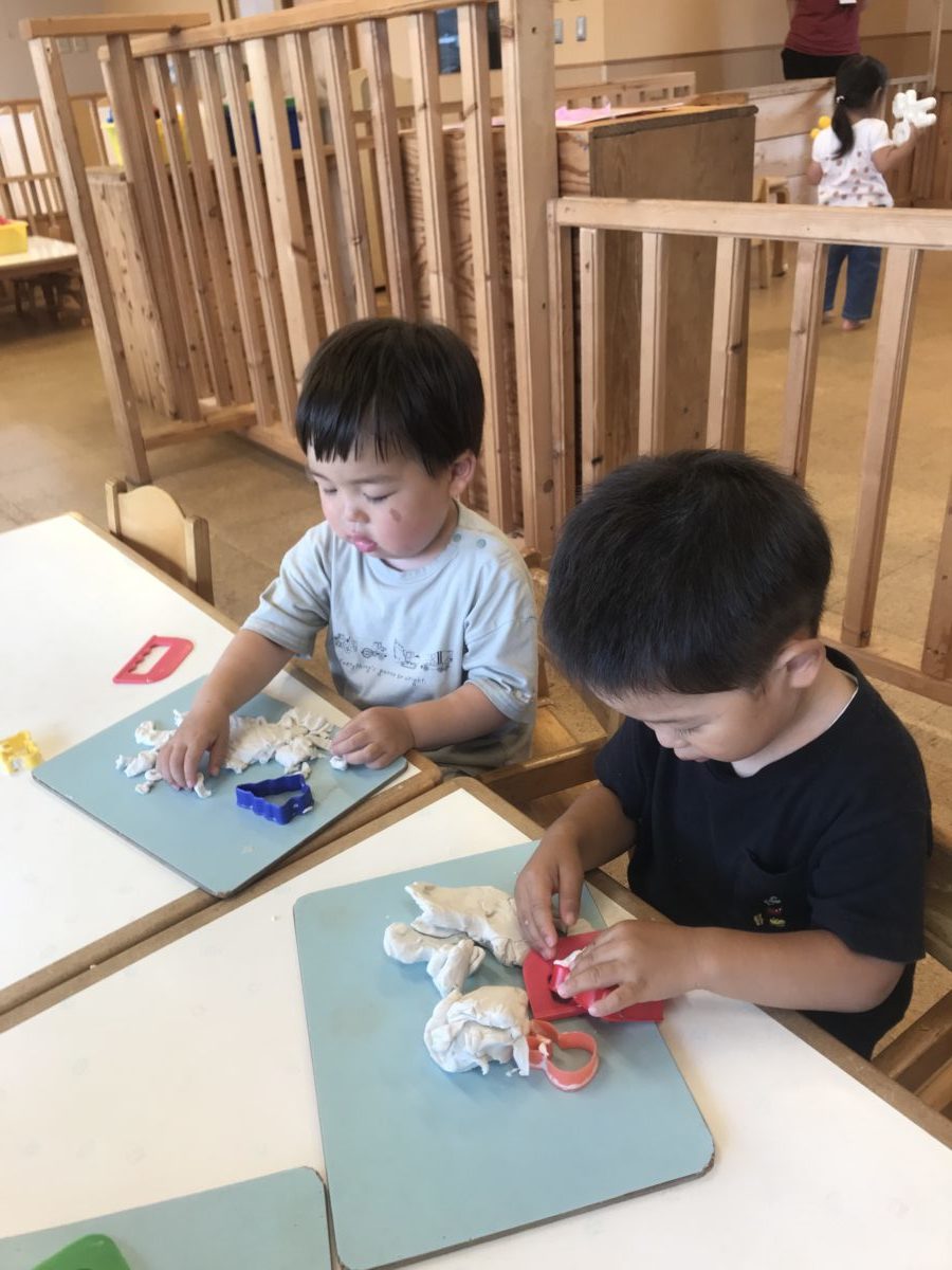 粘土をしていたお友だちは、自分の好きな形の型を選ぶと、粘土をギュッ!と入れてゆっくりと型から外し、形ができると「見て見て!」と嬉しそうにお友だちと見せ合いっこをしていました。