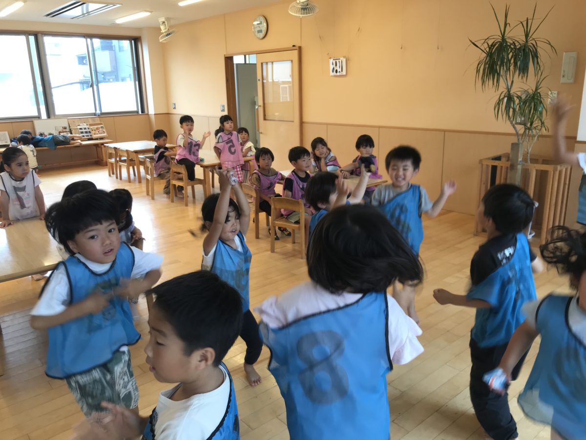 雨が続き園庭に行けず残念そうな子ども達でしたが、「ダンスしたい!」との声があり室内でダンス発表対決が始まりました。チームに分かれ1チームずつ前に出て発表し他のチームのお友だちはお客さんになりきっていました。前にでて踊っているチームは元気よく体を動かしており、踊りが分からず困っているさくらんぼ組さんがいると向かい合わせになり「こうやってやるんでー」と見本を見せたり、お客さんになったチームは「○○ちゃんじょうずー!」と褒め合いっこをしたりとダンスを楽しむ姿がありました。
