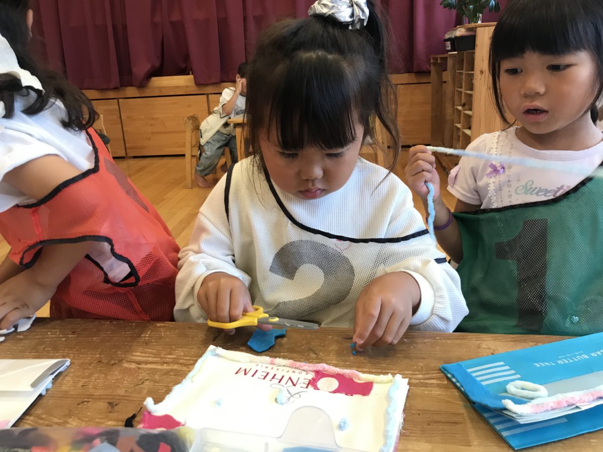 また、先日から財布作りに夢中のめろん組さん。前のめろん組さんが作った財布の写真を飾ってみると「これおぼえてる!○○くんのやつや!」「こんなやつつくりたい!」「どうぶつにしたいな!」と自分の作りたい財布をイメージしてお友だちと会話を弾ませたり、続きで財布作りをしている子はフェルトや毛糸、色紙などをハサミを使って器用に飾りつけをしている姿がありました。財布作りをしている中で「おかねもっとるひとー?」「5こあるよー」「もってない!」とお金の話で盛り上がっている様子。お泊り保育に向けて『アルバイトぼしゅう』の紙を掲示してみると「なにこれ!?」「あるばいと?」「やりたい!」と少しずつお手伝いをする姿が出てきました。