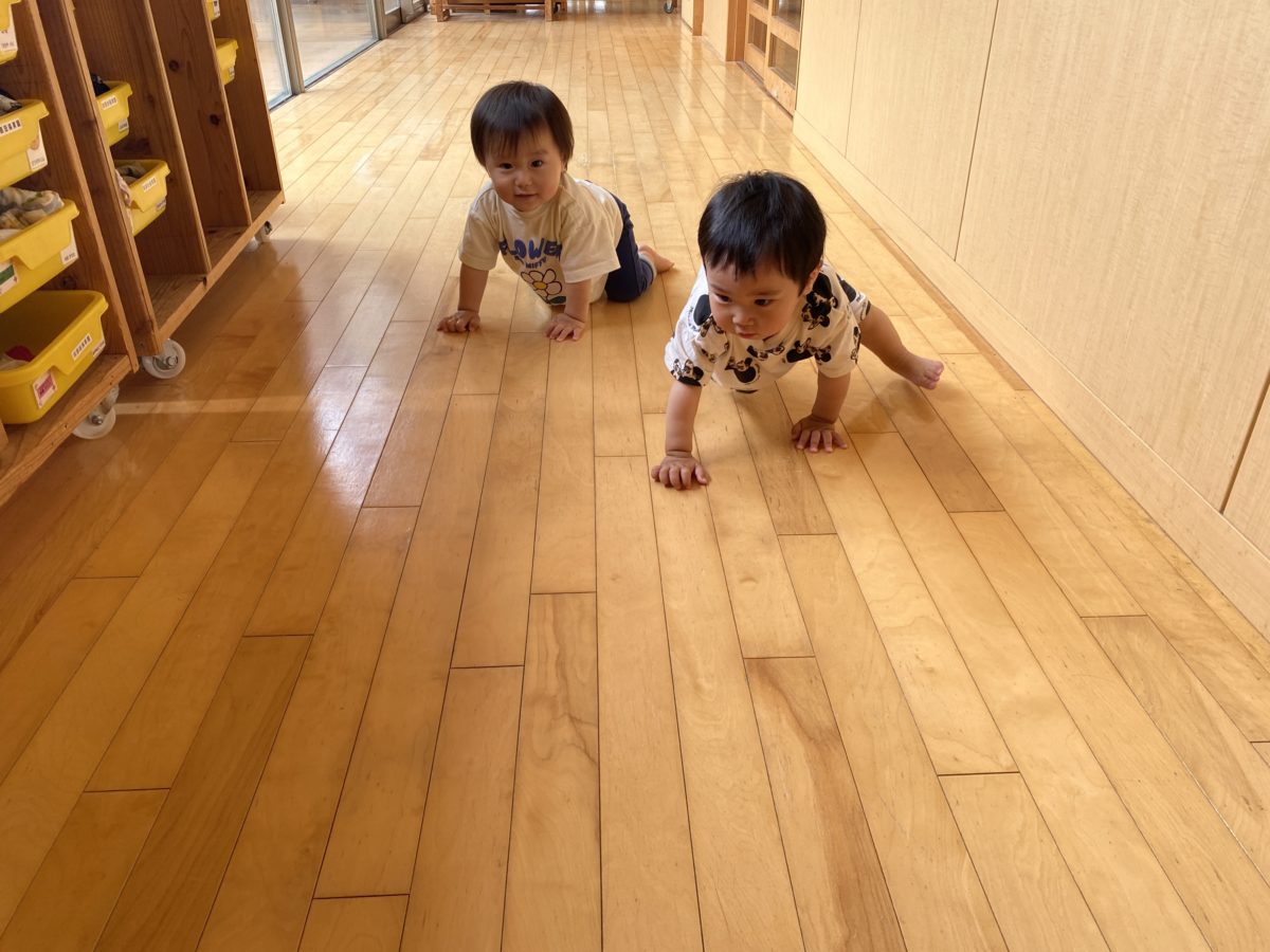 どっちが早いかな。すいか組のお友達のハイハイ競争です。