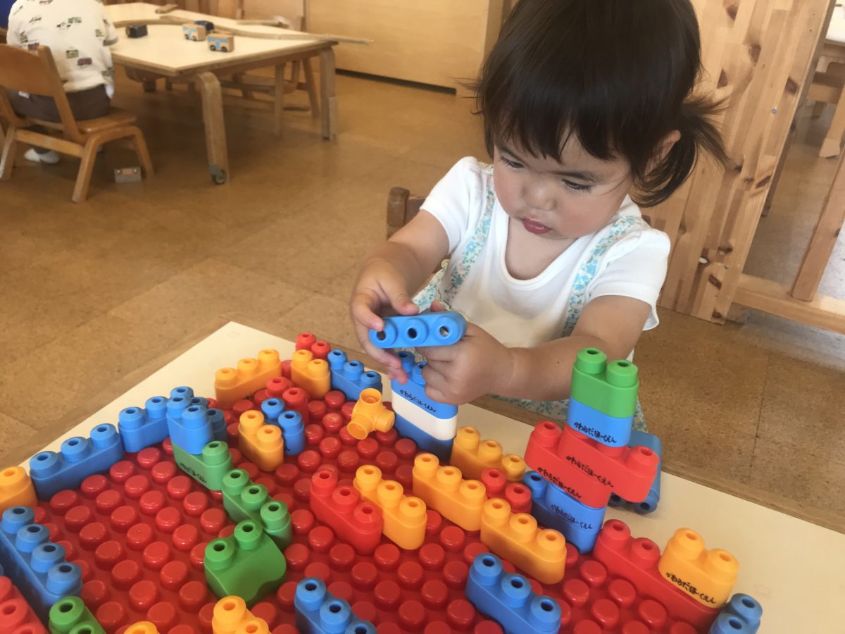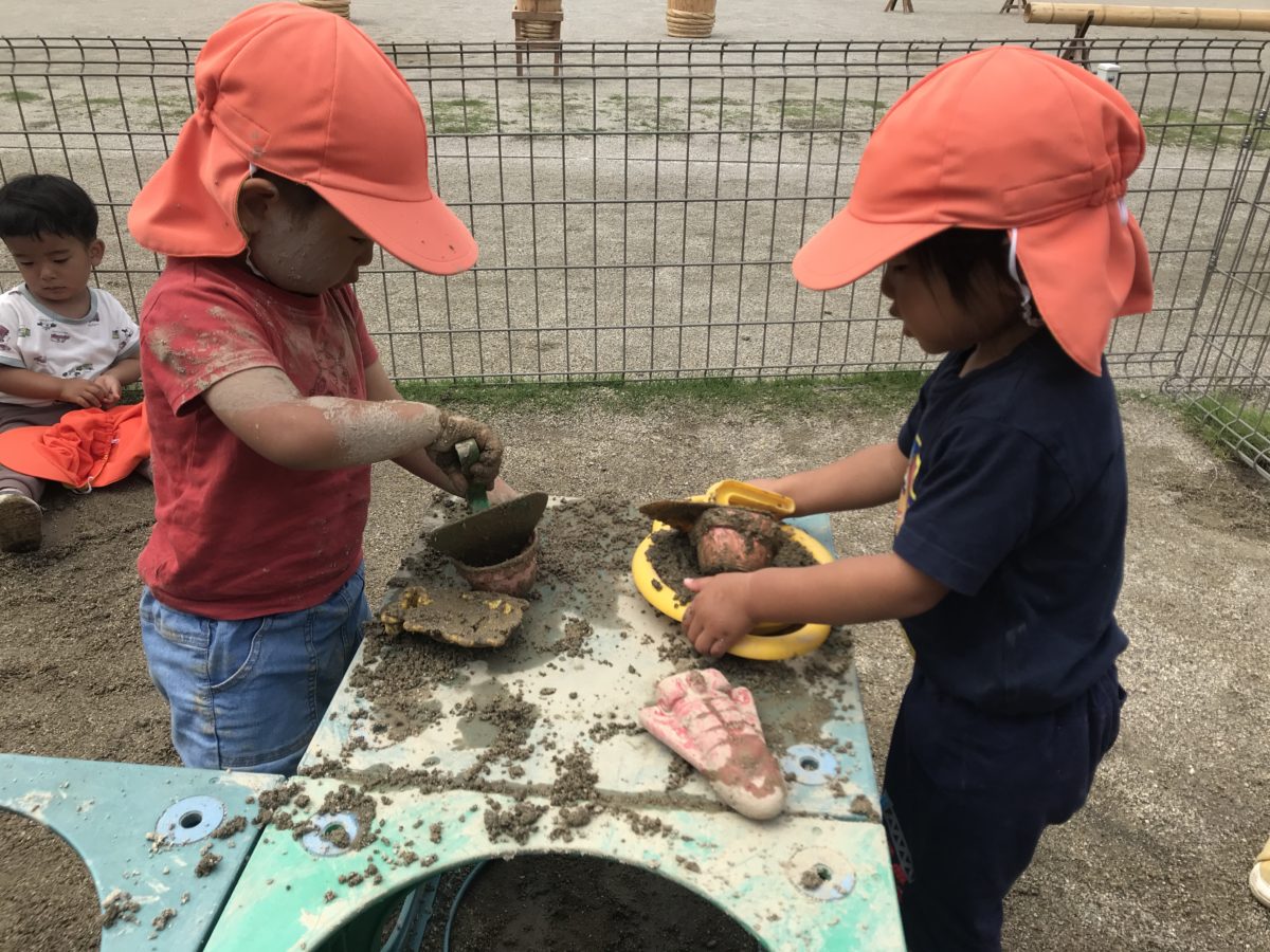 昨日の雨で泥んこ遊びには丁度良い湿り具合になっていました。お団子を作ったり、お友だちと協力してペタペタと大きなケーキを作り「いただきま~す」と食べる真似をしていました。手のひらいっぱいに泥の砂をのせて、「ハンバーグ」と言って見せてくれたり、お友だちに「チョコレートだよ」と教えてあげたり、子供たちの楽しい想像がたくさん膨らんでいるようでした。お皿に砂のご馳走を入れてお友だちを誘いドライブに行くお友だちもいました。「ピクニックだね」「ついたよーおべんとたべよっか」と楽しい会話が聞こえてきました。