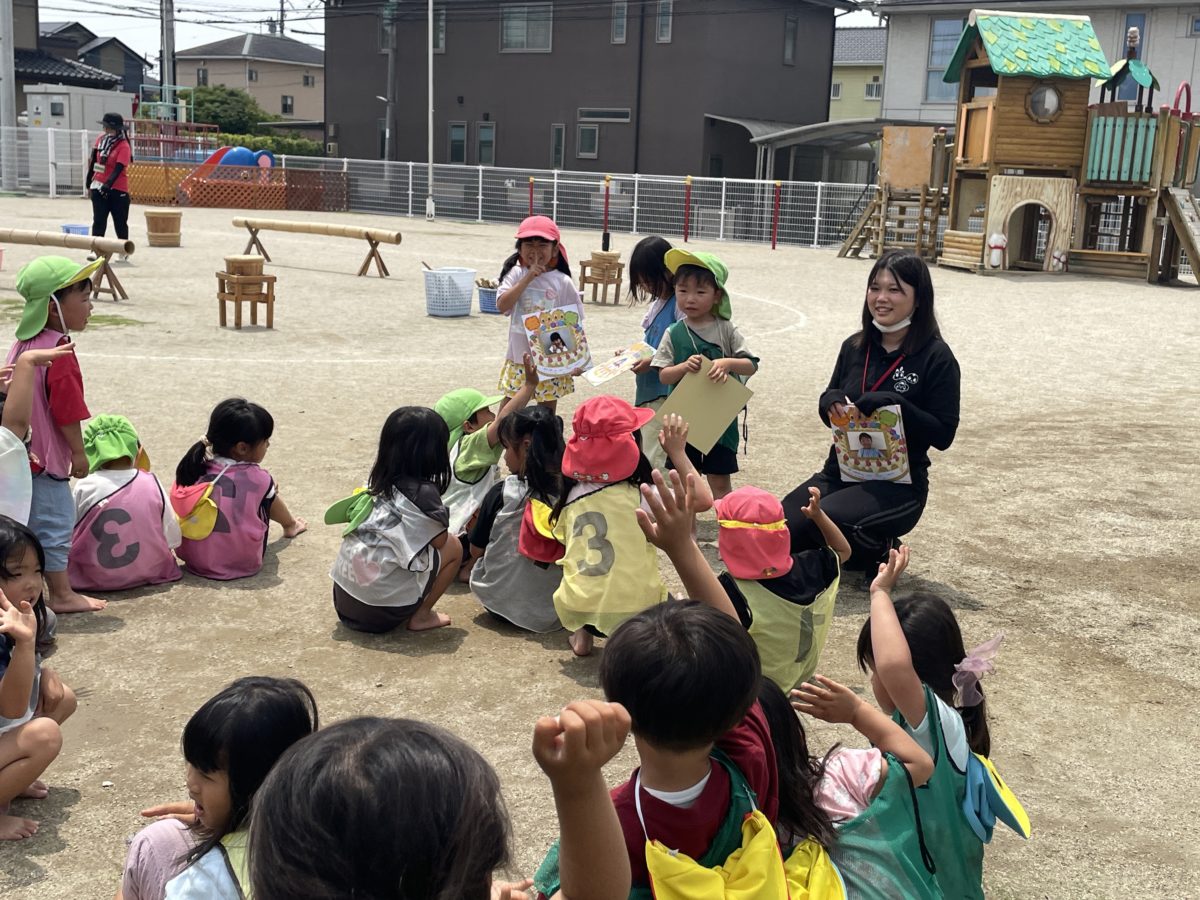 登園してきた際に自分のお便り帳のバーコードを読み取った後に、小さい子がうまくバーコードが読み取れず困っていると「できやんだん?ちょっとかしてみ!」と大きい子が代わりにバーコードを読み取りのお手伝いをしてくれていると「ピッてなった!」とうまく読み取れた時の音が聞こえ「よかったね!」とその子へもう1尾お便り帳を返してあげるばなな組さんの姿がありました。そして園庭では…リレーやダンスを子どもたちも日々頑張っている姿があり、今日はめろん組さん各チーム前に出てお手本になって踊っているとダンスの最後の決めポーズがかっこよく決まっているチームがたくさんありました!!その姿を見てばなな・さくらんぼ組のお友だちも「こうかな!?」と見て真似している姿もありみんなの決めポーズがたくさん見られました。リレーでは、みんなが一丸となって頑張っている姿があります。さくらんぼ組のお友だちもバトンを大きい子から受け取り、自分の力を発揮して一生懸命走るス多賀はとってもかっこよかったです。お部屋では、「このまえのつづきがしたいな・・・」と話す姿があり、紙やのりを準備すると、「まるつくっていっぱいつなげたよ~!}「みて、こうやってしたらはーとみたいなかたちになったの!」と紙をくっつける場所を変えるだけで、ハートのような形になり、「それかわいい!」「どうやってつくるの?」とかわいい形の輪飾りにも興味津々!同じ輪飾りでも糊を付ける場所を変えるだけで全然違う形のものになり子どもたちの工夫や発想で形の違うものが出来上がっていき「ここをくっつけたらどうなるかな?」と面白さを感じているようでした。