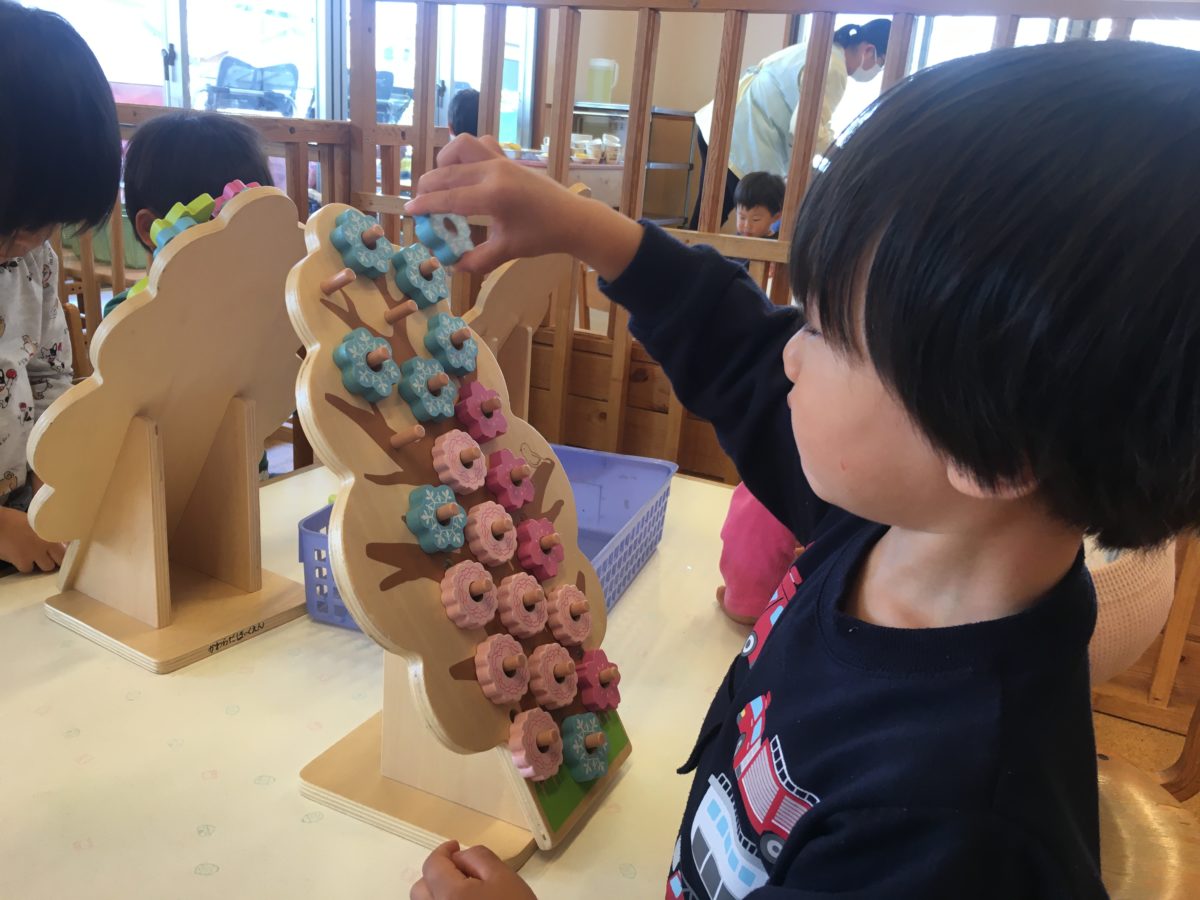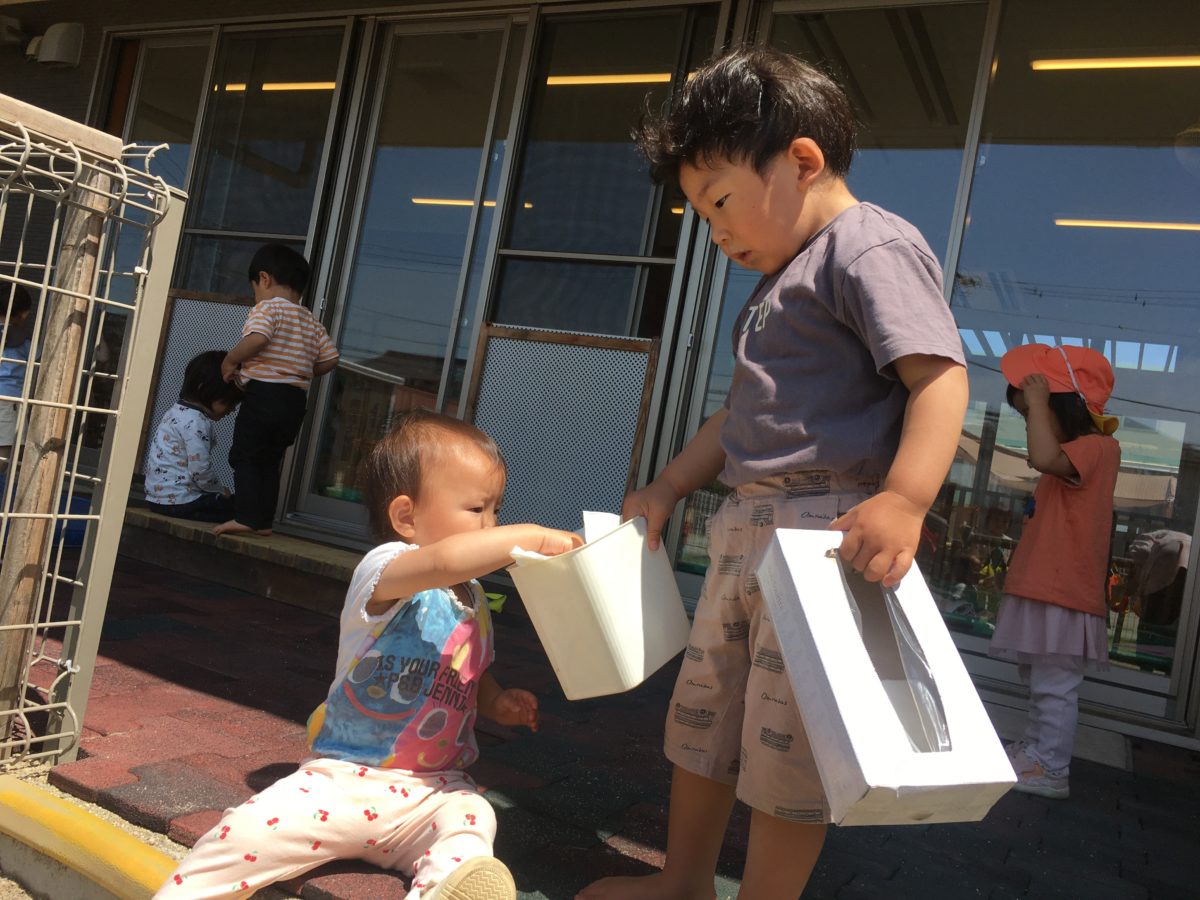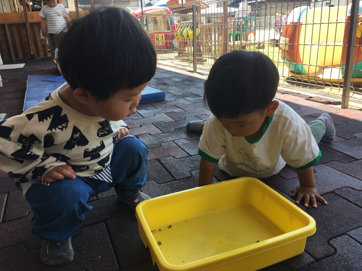 テラスに敷き詰められているタイルをめくってみると、昨日に引き続き沢山のダンゴムシを発見!早速トレーにダンゴムシを移動させてみると「ダンゴムシだ~」と興味津々な様子です。「わ!うごいた!」「あるいているよ」「ころんってなったね~」とダンゴムシが動く様子を真剣にみてみたり、中には手の上にのせて歩かせてみたり。すっかりダンゴムシに夢中な子ども達。「これみてー!」とお友だちとダンゴムシが入ったトレーを囲みながら見ていると、「なんかきた!」とまた新たな虫のお客様。「なんかくろい!」と黒い虫の招待は、赤と黒が反転した黒いてんとう虫。あまりの不思議な色に子どもたちもびっくり!「くろなの」「へんないろ!」と見た事のないてんとう虫を真剣に観察しています。時々羽を広げ飛ぼうとしたり「わ!うんち?」「ちがうよおしっこだよ」とてんとう虫の様々な動きに興味津々な子ども達でした。お部屋では様々な形をした積み木に夢中な様子。丸い円柱型の積み木を並べてみたり、V字の積み木を工夫しながら積み上げてみたり。それぞれ色々な積み上げ方を考えながら積み木遊びを楽しんでいました。