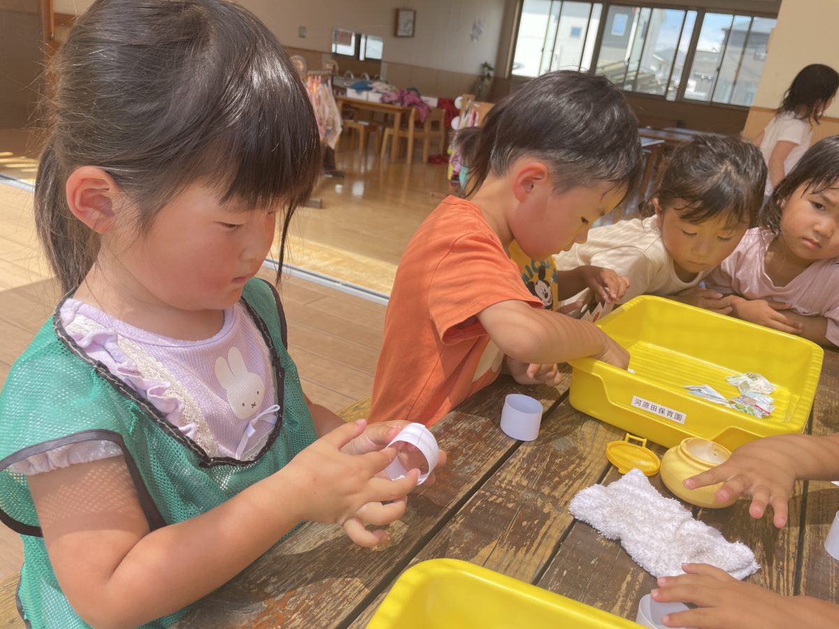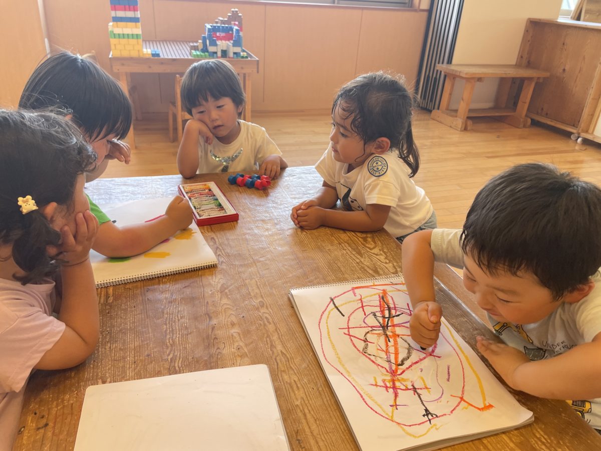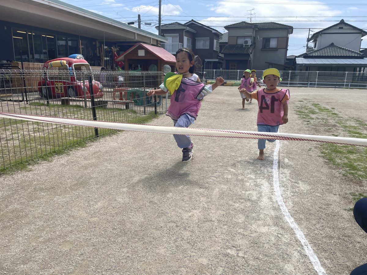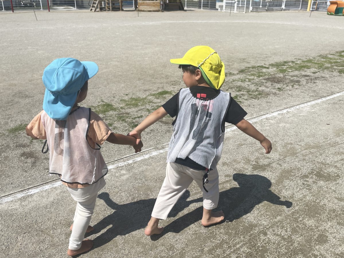 今朝…廊下をカニが歩いているのを発見!!「かにがいる。」と子どもたちもビックリ。捕まえて少しだけ様子を見ていると「なにがおるん?だんごむし?」と登園してきた子たちも興味津々な様子で見に来ると「ちがうよ!かにさん。」「ほいくえんのなかにかにがおったん?おきゃくさんやな。」「ちいさいカニだからはさみも、ちいさいね。」「よこあるきしていたかにさん、のぼろうとしてる!」と子どもたちは色々なことを気づきながらも興味を持って観察している姿がありました。そして今日他園交流ででかけていためろん組さんに代わって、ばなな組さんが「あれ?○ちゃんおらんな。よんでくるわ!」「いっしょにほわいとちーむのとこいこ!こっちやで」「もうぜんいんならんだ!!」となんとも頼もしい姿を見せていました。かけっこでもいつも以上にお友だちとの対決に気合を入れているばなな組さん。また、さくらんぼ組さんも「がんばるー!」とゴールテープのところまで全力でトラックをかけていく姿があり、いい勝負が繰り広げられると「いまどっちがかった?」と見ていたお友だちに結果を聞くような様子もあり、1位になりたい!と思っている気持ちが伝わってきました。またお部屋では、さくらんぼ組さんが「これ、このまえおおきいこたちがやってたやつ、わたしもやってみたい!」と糊を少しだけ指に取り「これくらいでいいのかな?1かいつけてみよ~!」と紙へ糊を付けて反対側の紙を合わせると…「くっついた!」「これくらいでよかったんだね。わかったー!」とどれくらいの糊で紙がくっつくのかが、やってみたことで気が付き「そんなにのりっていらないんだね~!」と近くにいた子もその子の姿を見て一緒に話している姿もありました。そこからどんどん長くなっていく輪飾り。「こんなにながくなったよ~!」とながーくなった輪飾りをお友だちへ見せ、たくさん作れた達成感を味わえたようでした。