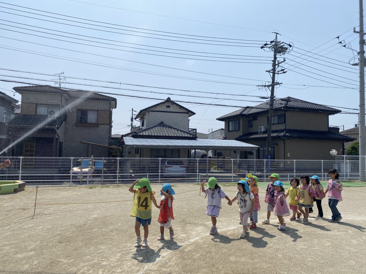 お水のシャワーの虹をくぐりながら、園庭のトラックを手をつないで歩くことを楽しみました。シャワーが近くなると笑顔がこぼれ、キャー!!と歓声も上がっていました。