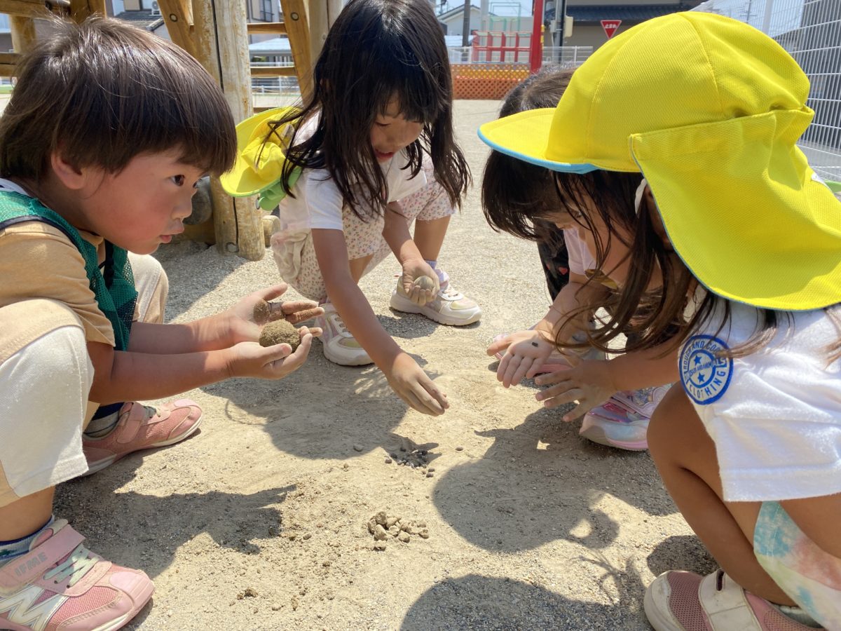 おだんご作り中にたくさんのダンゴムシを発見!!興味を示したさくらんぼ組さんに「さわってみる?」「ほしい?」と優しく声をかけていました。