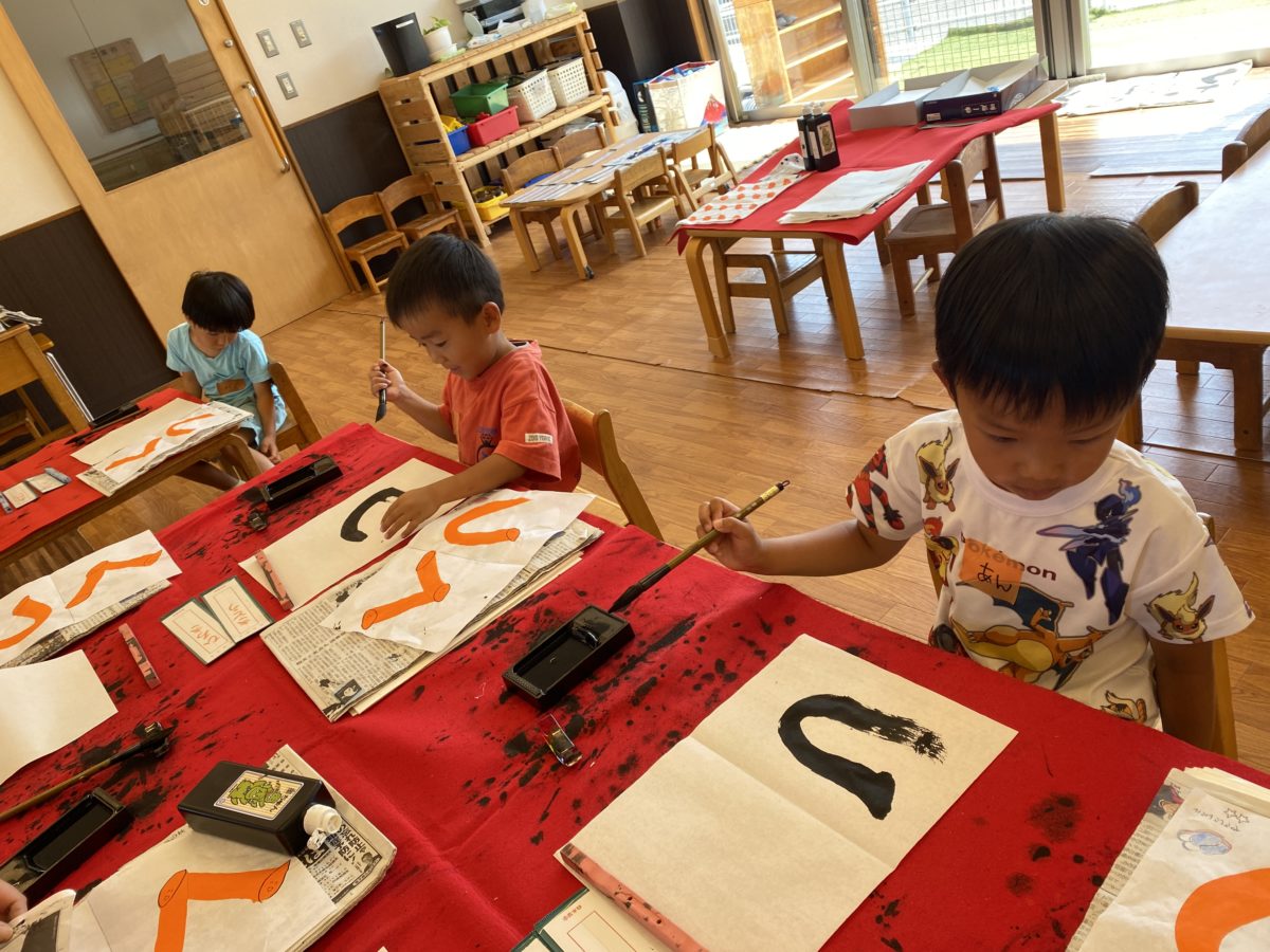 今日はめろん組さんは習字教室とダンス教室に参加しました。習字教室は、「く」と「つ」の文字を書き始めの形のしずくの形をこだわって挑戦しました。お手本をみながらなめらかなしずくの形をイメージしながら書いてみようと、じっとよーく形を見て書いていました。素敵な真剣な表情が見られました。さくらんぼ組さんはめろん組さんと一緒に好きな曲のダンスをペアになって楽しみました。手をつないで踊ったりタッチ!!を楽しんだり、かわいい姿が見られました。園庭ではばなな組さんとさくらんぼ組さんでシャワーのトンネルをくぐりながら手をつないで歩くと、シャワーが近くなると「キャー!!」と歓声があがったり、お水に触れることも楽しんでいました。午後からはめろん組さん、ばなな組さんだけのリレーを楽しむと真剣勝負!!の速さにこだわるたくましい走りが見られました。つぎ!!つぎ!!とどんどんバトンを回していったり「がんばれー!!」と元気な応援の声があがっていました。全力な走りを見せながらも、バトンを渡す時にはついこぼれてしまう笑顔がとても素敵でした。