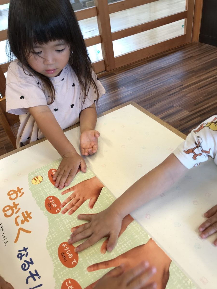 大型図鑑『からだ』に載っている手に自分の手をあわせて「いっしょだね!」と。
