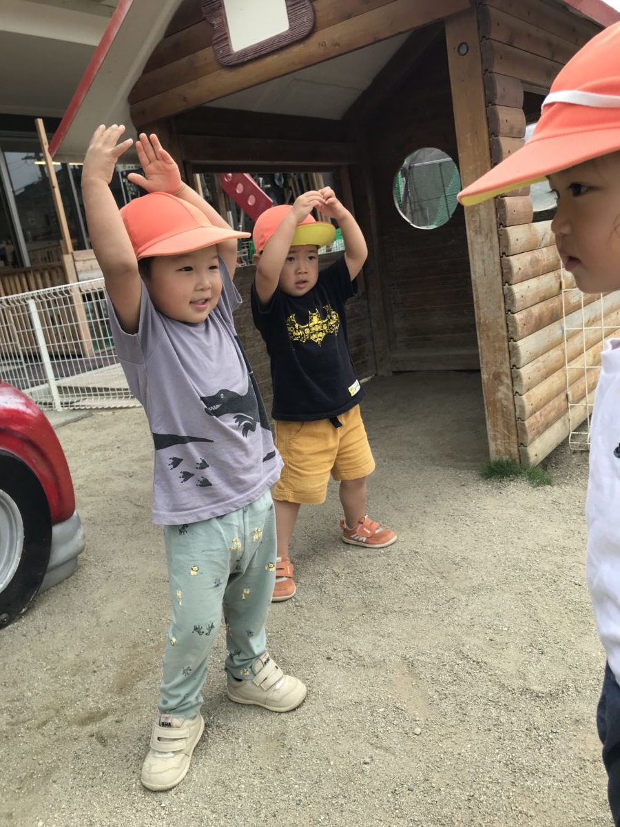 園庭で遊んでいると以上児のお友だちが今週の運動会でのダンスを踊る姿が。すると未満のお友だちもジャンプしたり、手や足をめいいっぱいに広げて一緒にダンスを楽しむ姿がみられました。