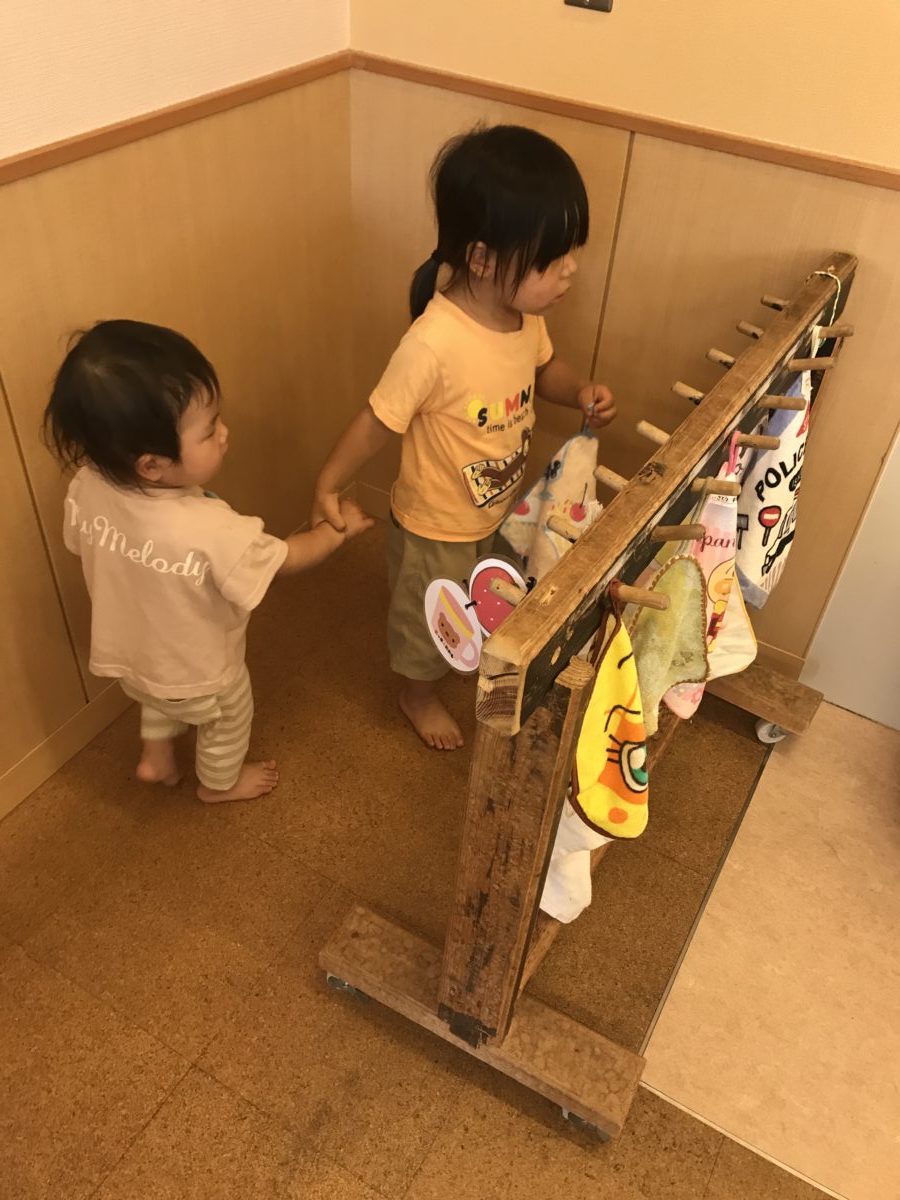 タオルをかける場所が分からず困っているいちご組のお友だちの手をひいて優しく誘導してくれるりんご組のお友だち。