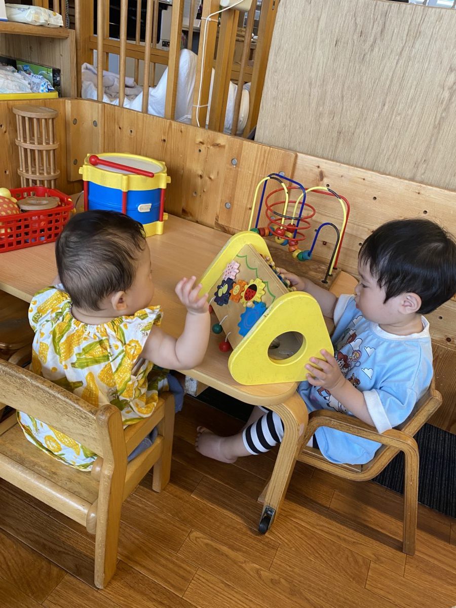 お部屋で大型絵本を見ていたお友だちは、「これ知ってる!」「怖いね~!」と写真を指さして会話をしながら、知らない虫を見つけ「なにこれ~!」「ここめくるの?」と仕掛けをめくると虫のお腹が見えて楽しそうに何度もめくっていました。動物の大型絵本を見ていたお友だちは、「これライオン!」「これワンちゃん!」と知っている動物の名前を出し合いながらページをめくり、絵本に付いていたふわふわの生地を見つけると「ここ触ってごらん!」「ふわふわやで!」とお友だちに勧めて一緒に触っていました。