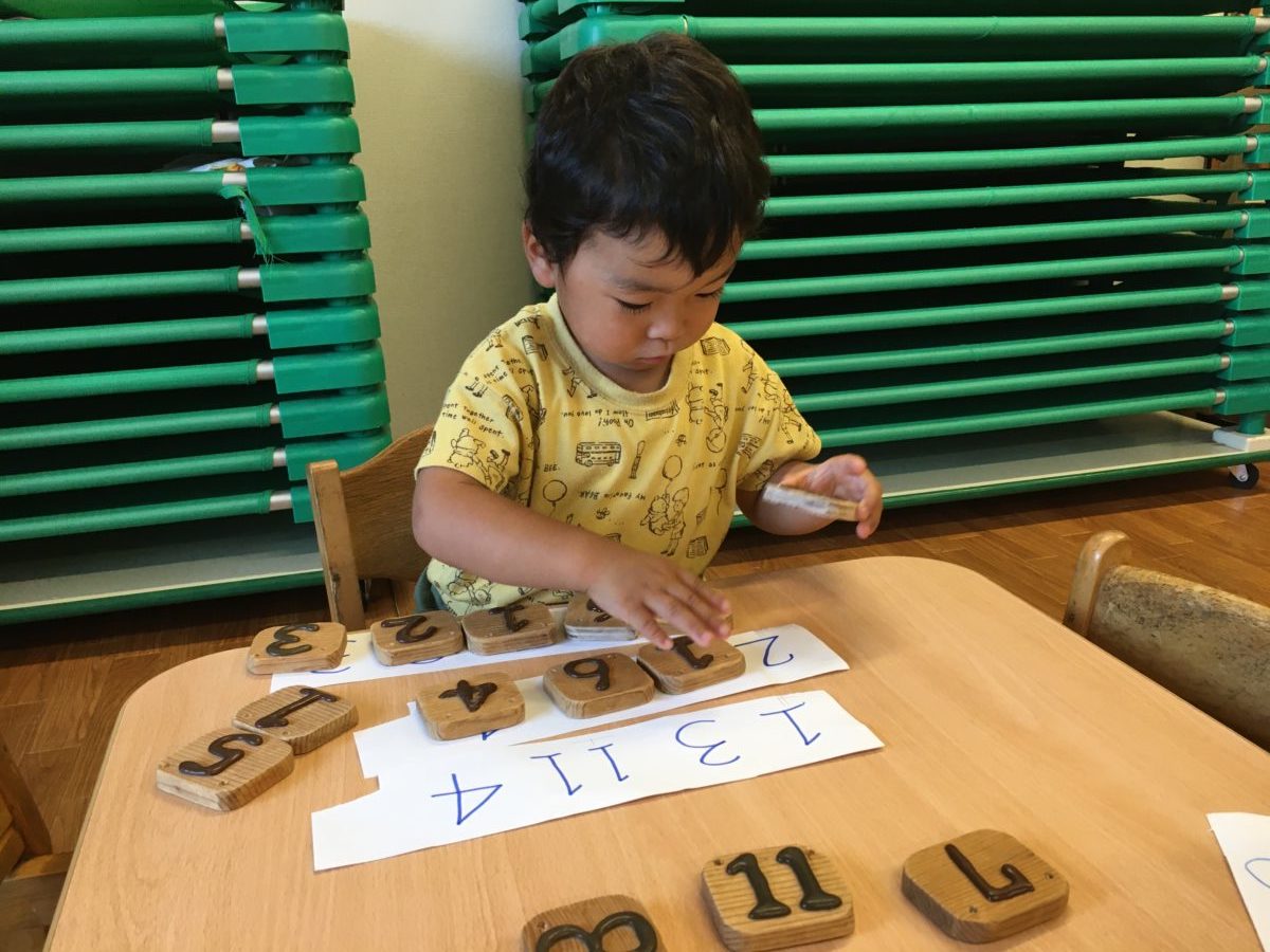 「これみたいの!」「〇〇くんはバスがいい!」と絵本が大好きな子どもたち。保育士が絵本を持っていると「これにする!」といつも色々なリクエストが聞こえてきます。中でも興味を示していたのが数字の絵本。1~10までの数字と、数字に因んだ食べ物や動物、物のイラストが載っている絵本なのですが「これいち!」「に!さん!」と元気いっぱい数字を見ながら呟く声が聞こえてきます。毎日おたより帳にシールを貼る中でカレンダーを見たりと、日常の中で数字を目にする事が多くなってきたりんご組さん。少しずつ知っている数字も増えてきたようで「これしってるよ!」と数字に興味を示す姿が見られるようになってきました。そんな姿を見逃しては!と数字の絵本と、数字が描かれた木製のプレートを準備してみる事に。早速手に取ると「これなーんでしょ!」と数字のクイズ大会が始まっていました。「これはさん!よん!」と次々に答えるお友だちや、「あ!これいっしょだよ!」と絵本とプレートを照らし合わせるお友だちなどなど。更には紙に様々な数字を描いてみると・・・その上に同じ数字のプレートを置き始めていきます!「みて!できた!」と見事全問正解!「つぎやりたい!」「〇〇ちゃんもできるよ」とお友だちと交代しながら数字のパズルに夢中な子どもたちでした。