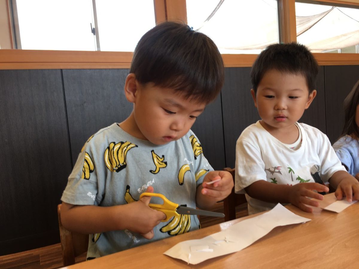 一方別の場所では、はさみに挑戦中のお友だち。「こやってしたら、ちでるね」「あぶないよ」とはさみが危険であることをお友だち同士で確認しています。確認後はいざ紙を切っていきます。切っている最中はみんな真剣な眼差し。順番を待っているお友だちも、お友だちがやっている姿を真剣に観察しています。「みて!できた!これポテトなの」「これはすいか!」と切れた紙の形から、色々な食べ物を連想しながら机の上には沢山の食べ物が並んでいました。