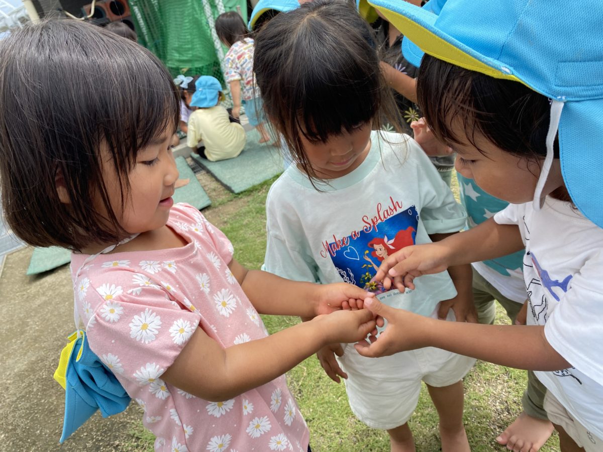 「だんごむしもみつけたよ!!」そっと手のひらを開けながらお友だちに見せていました。