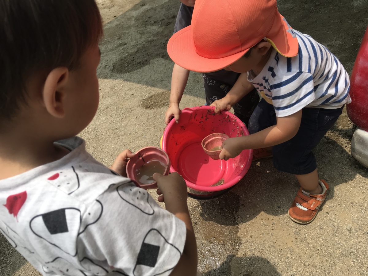 砂遊びをしていたお友だちは、バケツに水が入っているのに気が付くと、カップを持ってきてすくってはお友だちと1つの場所に水を撒いている姿がありました。水の量が少なくなってきてどうやったら入れられるかな?と考えてバケツを自分で持ち上げてカップに注ぐと、水を撒いて濡れた土でどろんこ遊びに発展していました。