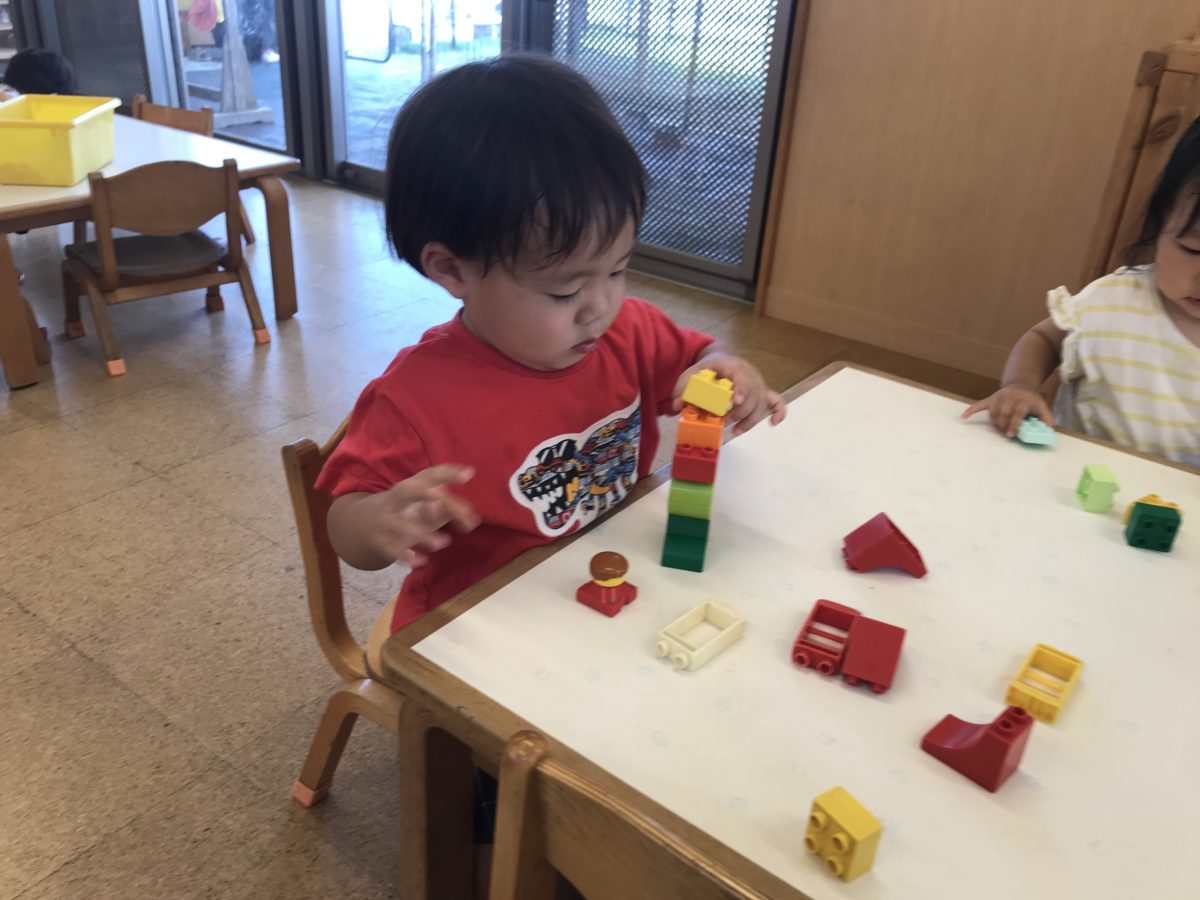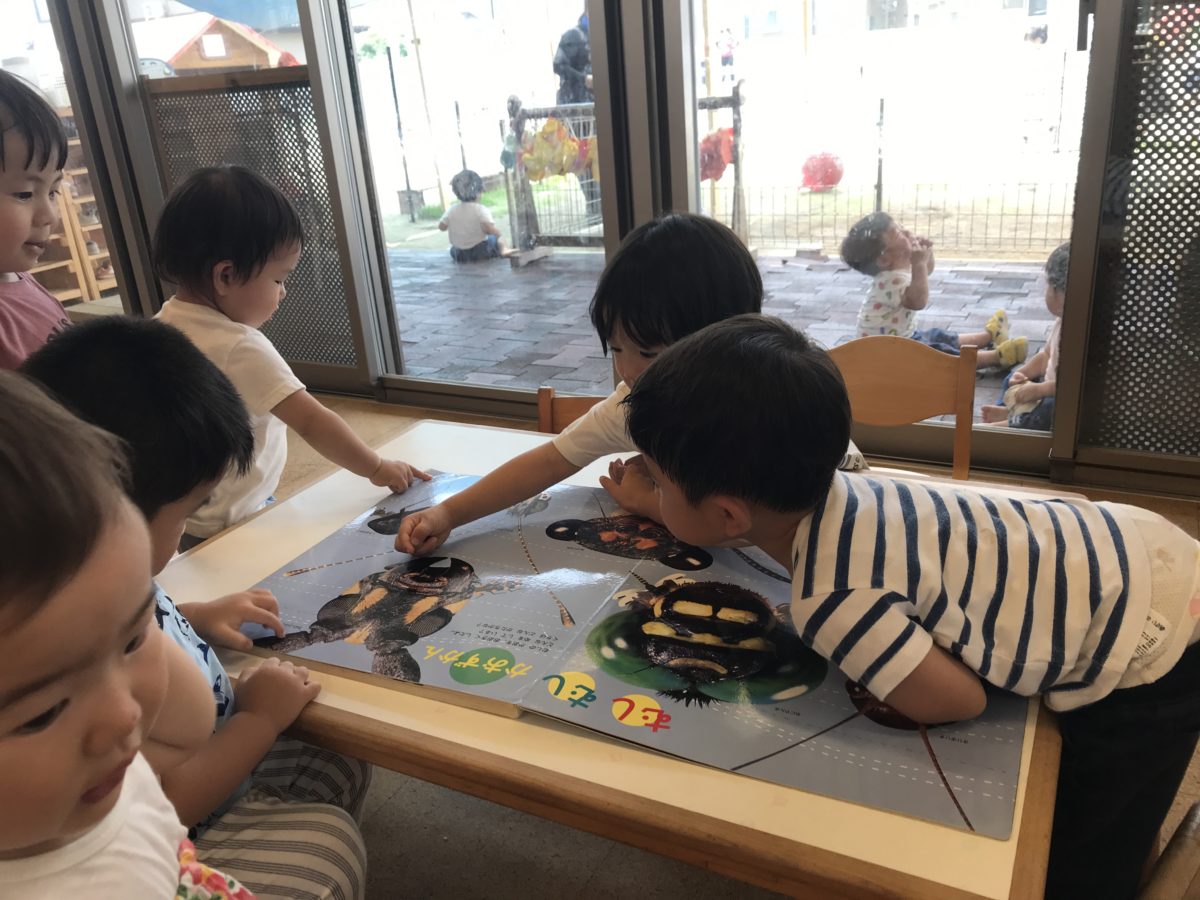 お部屋に置いてある虫の図鑑のページをめくって「かまきりどれ~?」と探していました。違う虫を指さして「これかな?」「ちがう~!」というやり取りが聞こえてきて「これ!」「見つけた!」とカマキリを見つけると嬉しそうに写真を見て、「これみどりや!」と捕まえたカマキリと色が違うことに気が付き、発見したことをお友だちに伝えている姿がありました。