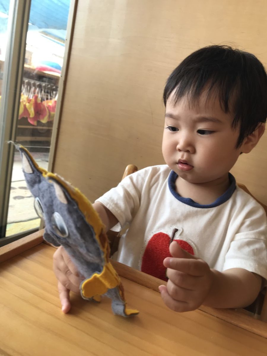 じりじりと真夏のような暑さでも「そといくの!」と元気いっぱい体を動かしながら園庭で遊ぶ子どもたち。中でも人気なのが砂遊び用のスコップやお皿・カップなど。スコップが入ったカゴを準備すると早速好きな道具を手に取り、穴を掘ったり砂を集めてみたり。カップやお皿いっぱいに砂を集めると、ベンチにずらりと並べ・・・「できた!アイスクリーム!」とどうやらアイスクリームを作っていたようです!「いらっしゃいませ~」「アイスつくってるの」「どれにしますか?」と気が付けば小さなアイスクリーム屋さんの開店です。「これつくるね」「ぼくはこれにする」とお友だちと役割分担をしながら砂のアイスクリーム屋さんはとっても楽しそうです。完成した砂のアイスクリーム。どうするのかな?と見ていると「ぱく!おいしい~」とお客さんに渡すのかと思いきや店員さん役の子がぱく!っと食べる真似っこ。本物ではないため残念ながら食べる事はできませんでしたが「アイスおいいしいね~」「もっかいつくる!」とまるで本物を食べているかのようにアイスクリーム作りを楽しむ子どもたちでした。