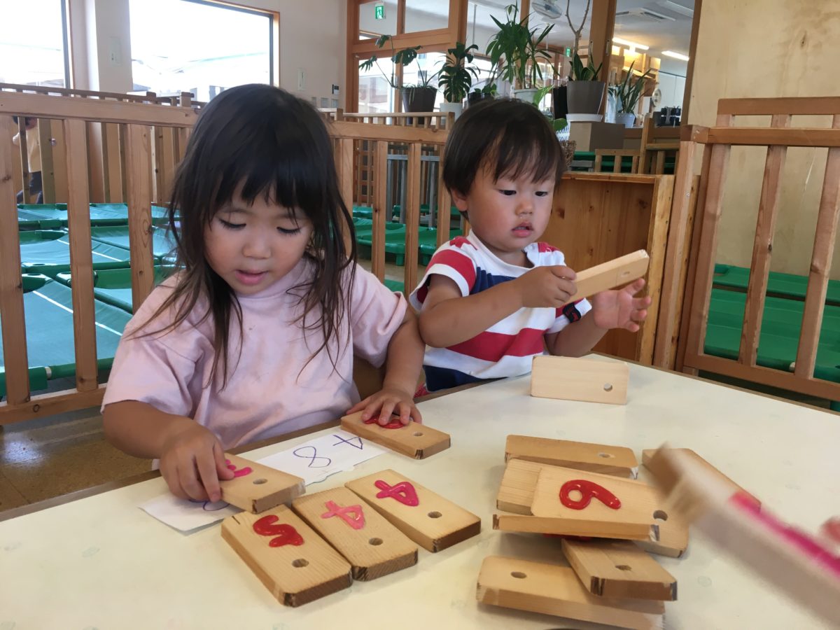 お部屋では前回に引き続き数字に夢中な様子。木製の数字のプレートを片手に、紙に書かれた数字と照らし合わせています。そんな中、数字が書かれたシールも準備してみたら・・・とこっそり置いてみる事に。「これなに?」とシールを手に取ると「いっしょ?」「いっしょだね~」とシールに書かれた数字と同じプレートにシールをペタリ!「ほらみて!」と嬉しそうに見せてくれました。