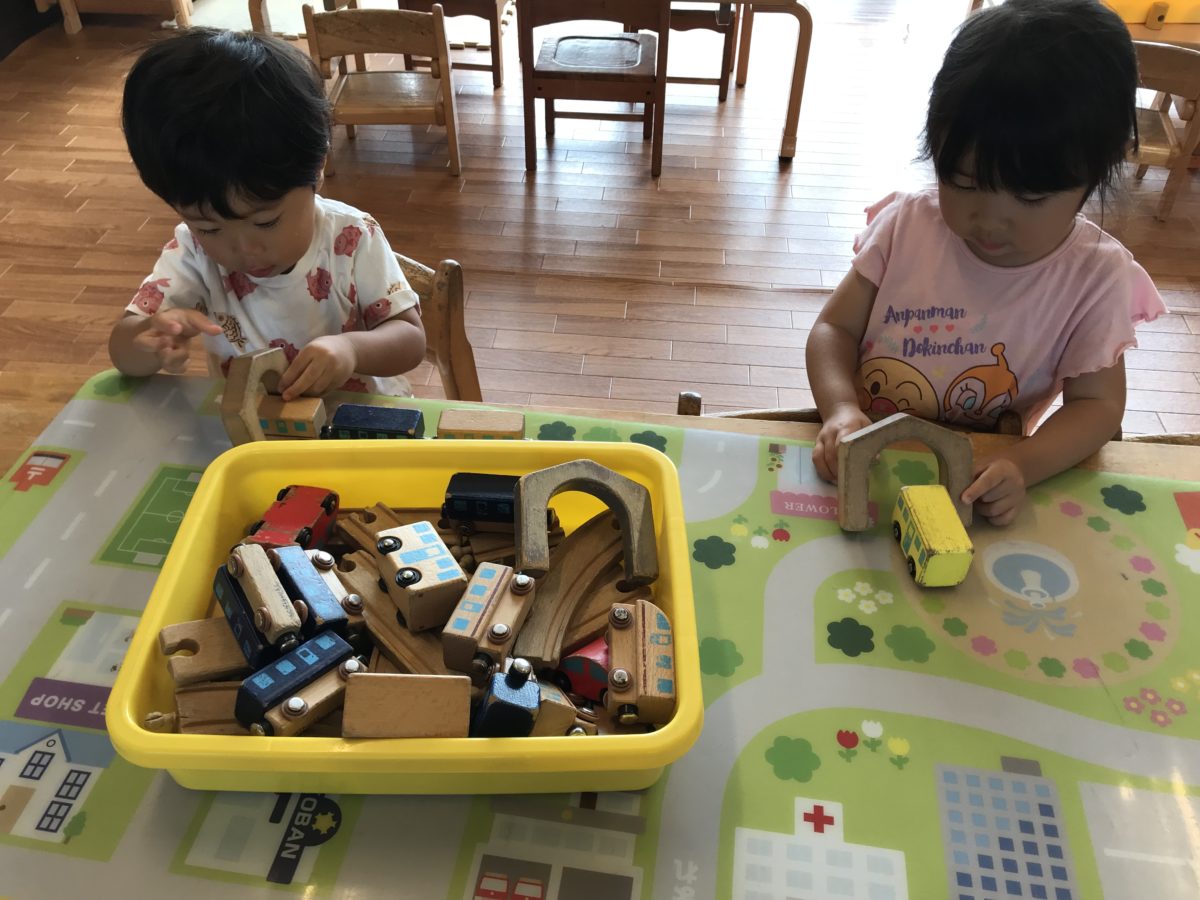 自分たちで線路を作ったり、トンネルを置いたりして「ガタンゴトンー」と言いながら電車で遊んでいました。