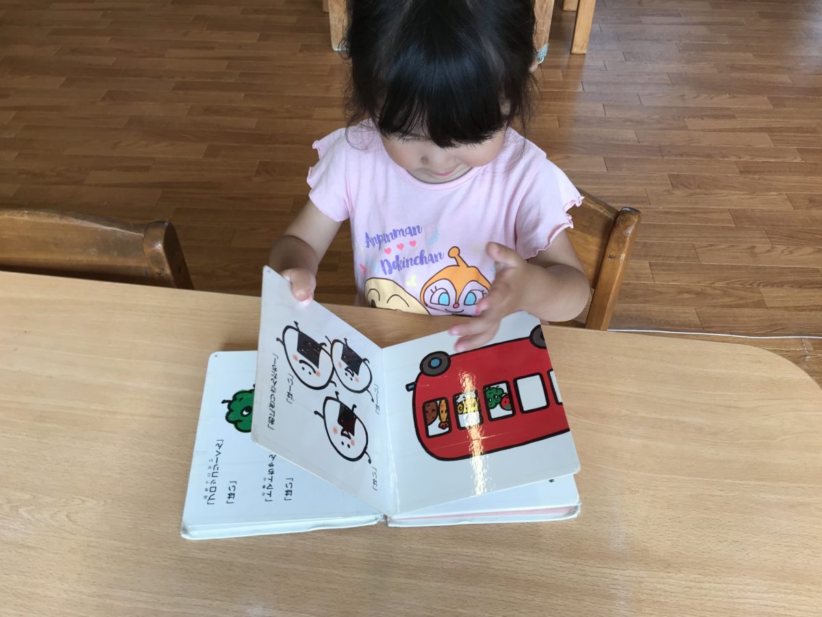自分の好きな絵本を選んで、「○○が出てきた!」、「バスに乗った!」などと言いながら読んでいました。