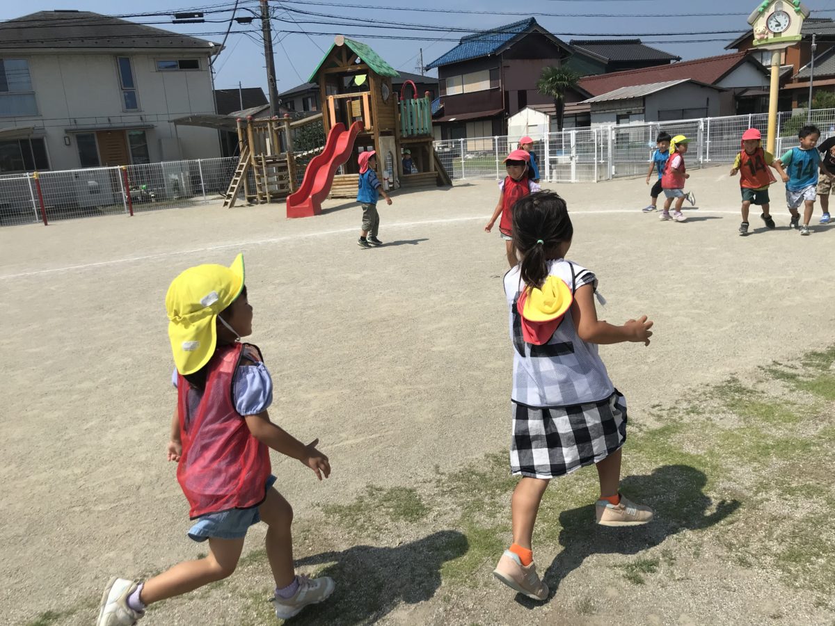 ひさしぶりにダンス鬼ごっこや桃太郎鬼ごっこに挑戦!初めて鬼ごっこに参加するさくらんぼ組のお友だちにルールを教えてあげる優しい姿がありました。