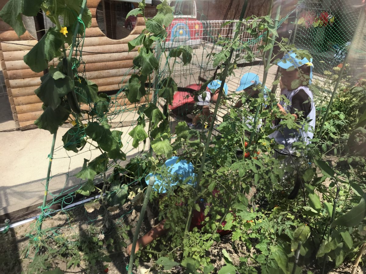 「またきゅうりできとる!」「あかいとまともあるよ!」とトマトやきゅうり、ナスがお休みの間に大きくなっており収穫することに!