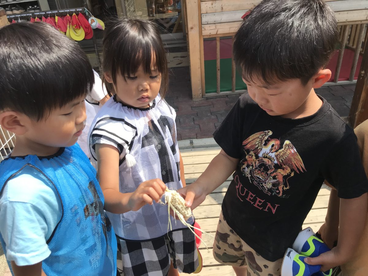 「え、なにこれ!」「はたけのとうもろこしじゃない・・」「だれかにたべられとる・・」と残念そうな表情。