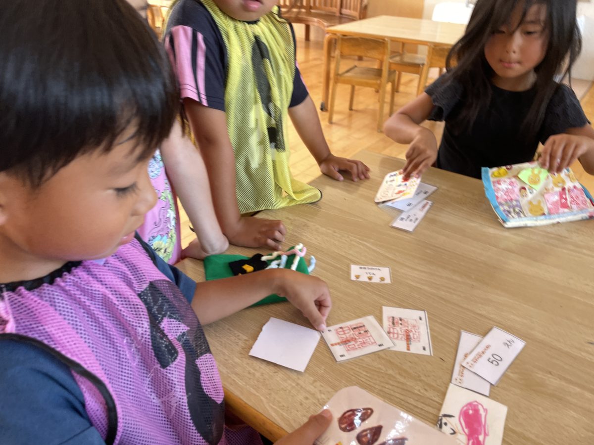 来週に迫っているおとまり保育!!めろん組のお友だちも毎日お手伝いをしてお金を貯めている最中。そしておとまり保育の掲示物を見ながら「かわらだおんせんほてるだって!とまるのに380いるってかいてある。」「380えんいるの?」「ばんごはんも200えんだって!あれ、そんなにおかねたまってたかな?」と自分が今、いくら持っているかが気になってきた子どもたち。そこでお道具箱から大事なお財布を持ってきてお金を数えてみることに…「えっとぼくはね100えんが1まい、2まい、3まい・・・5まいあるから500えん!!」「「ねー50えん2まいで100えん。100えん4まいで500えんやった。でも、500えんじゃたりないかもしれない!!」とお友だちに聞いたりえーどうしよ!!」と自分の手持ちのお金では少し足りないことに気が付き「きょうから1しゅうかんおてつだいがんばらないと!!」とやる気が増し「あーたのしみだなぁ~おとまりほいく☆」と子どもたちからワクワク感が伝わり楽しみにしているようです!園庭では、今日もリレー対決!さくらんぼ組さんも以前よりも真剣勝負で取り組む姿へとなり、大きい子のようにバトンをもらうときには少し前までもらいに行こうとしたり、バトンをもらうときに腕をぐっと伸ばしてお友だちが来るのを今か今かと待つ素敵な姿へと変わってきます。終わった後には「りれーたのしかった!もう1かいやりたかったなぁ!!」とリレーで感じる、競うことの楽しさも得られるようになってきたようです。給食の後にお絵描きを楽しんでいたばなな組さん。自由画帳いっぱいに漢字やひらがななとを書いて文字にも興味がわいてきたり、かけるようになったことが嬉しくてたくさん書いている姿がありました。するとさくらんぼ組のお友だちも「わたしはすうじがかけるようになったの。2がかけたよ!」と運動会でビブスを着る機会などが増えて数字にも親しむこともあり数字への興味が広がってきている姿もありました。