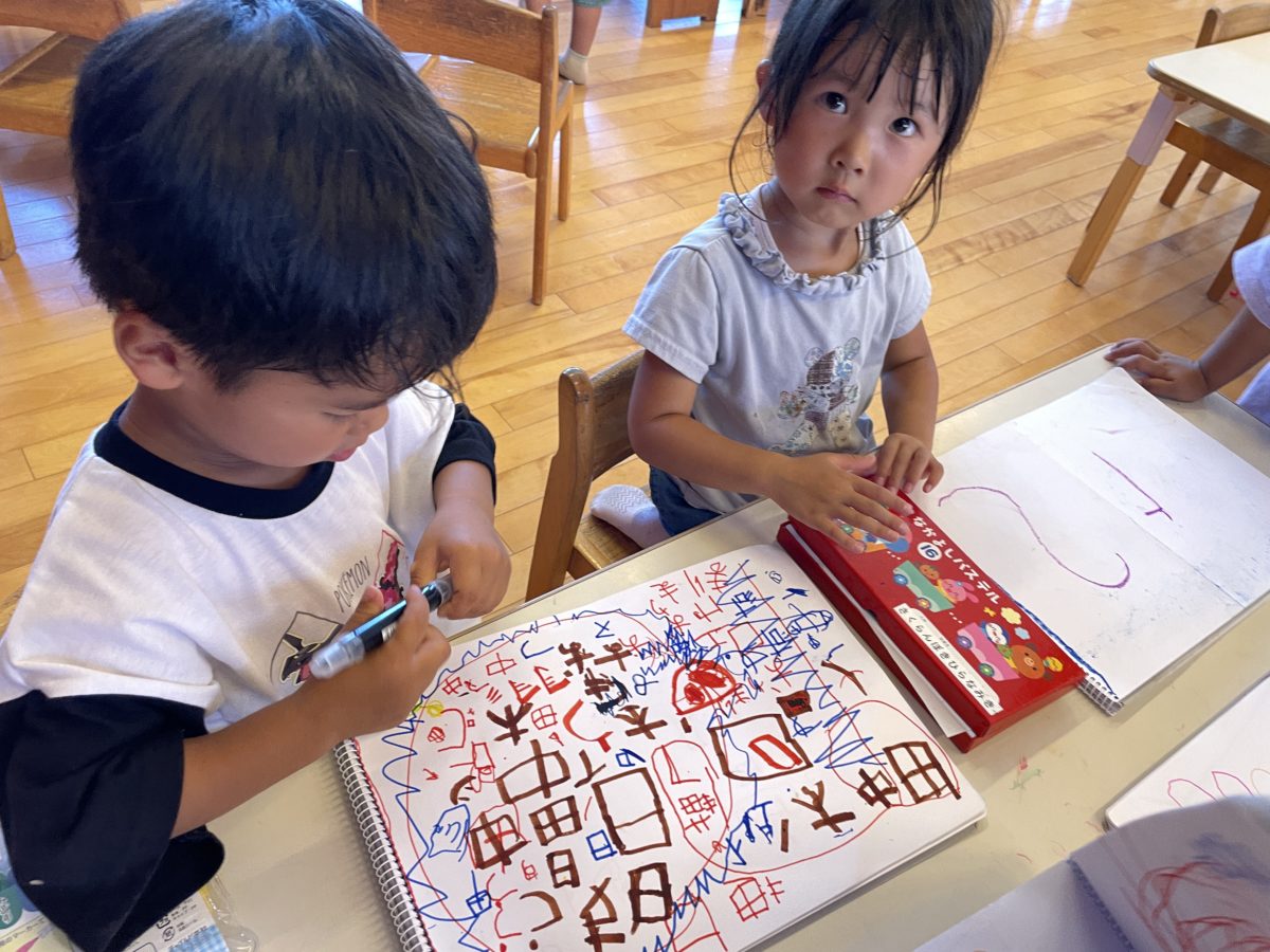 自由画帳いっぱいに漢字や文字をたくさん書いていたばなな組さん。 またさくらんぼ組のお友だちも「みてー!2がかけるようになったの!」とさくらんぼ組さんは数字が描けるようになったのを喜び自由画帳にたくさん書いて楽しんでいる姿がありました。