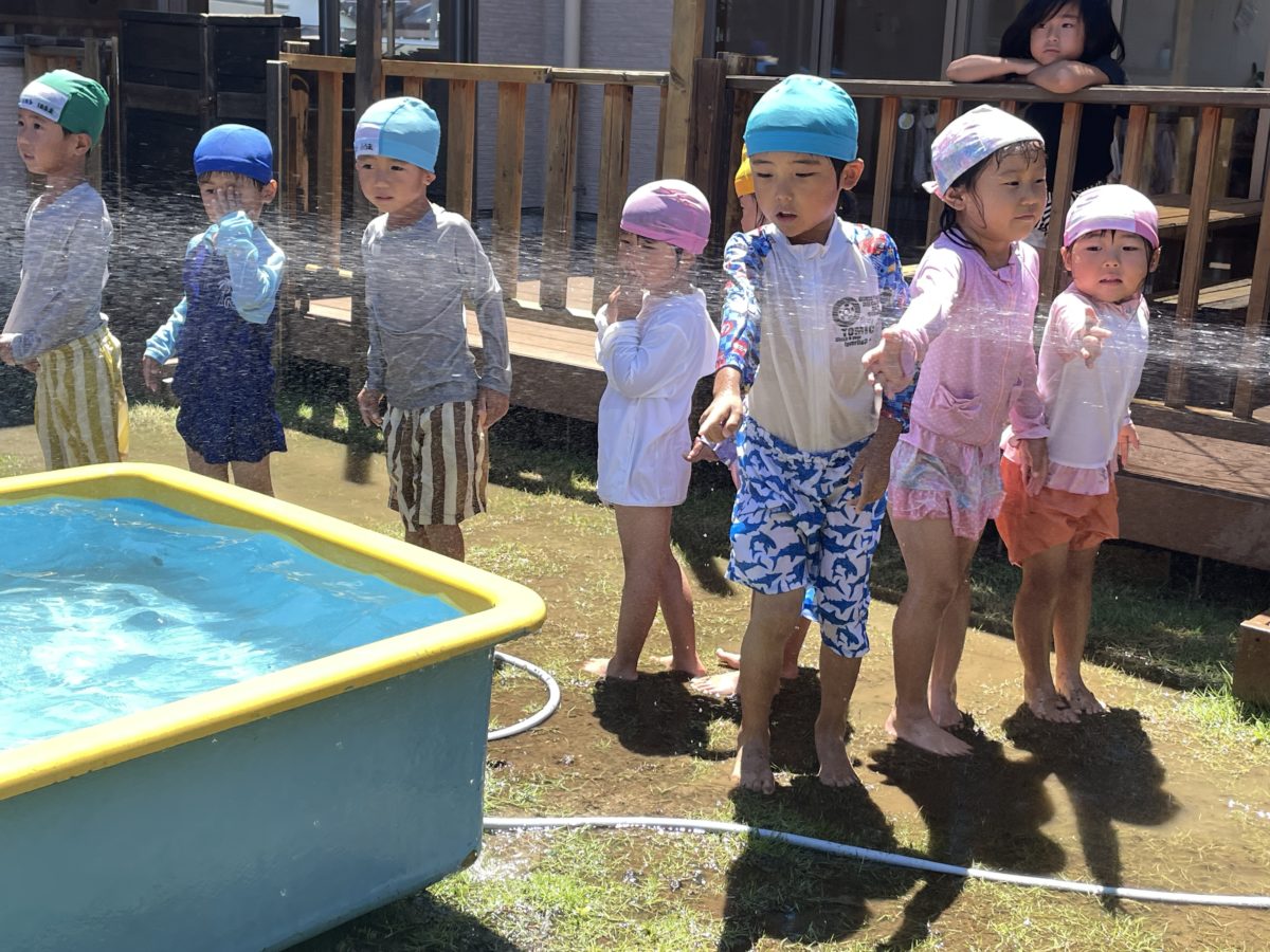 ホースから出ている水で虹が出来ていたのを見つけ「みてー!にじができてるよ!!」とみんな虹探しをしていました。