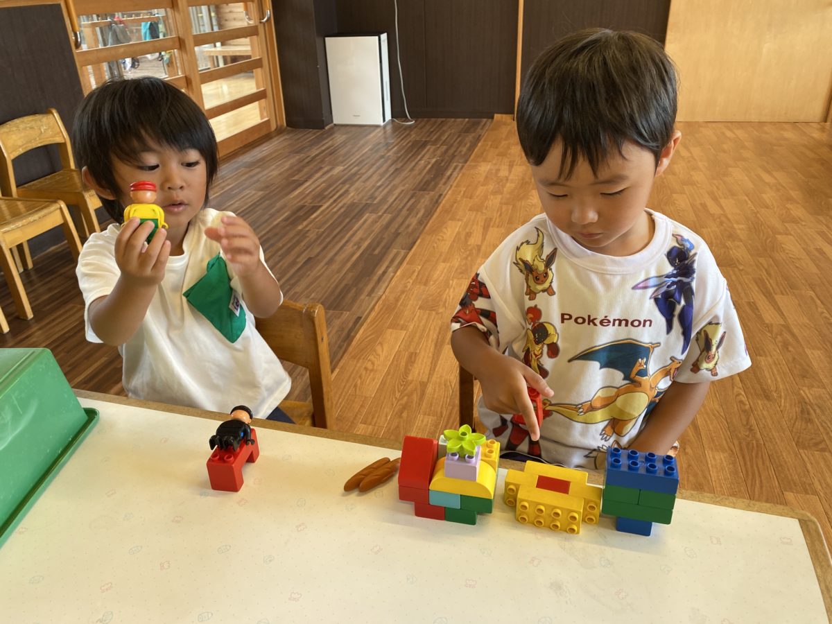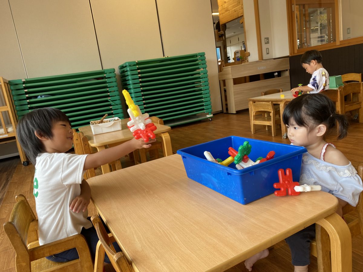 朝は急な雨に「あっ、あめふってる!」と驚きながら少し残念そうにしていましたが、雨が止んだことに気付くと「おそと、いきたい!!」と外遊びも楽しみながら元気に過ごすことができました。フェンスについた雨粒をそっとさわって喜んだり、溝近くに急に伸びた草に気付くと「すごいくさ、はえなかった?」と草の成長に驚く姿も見られました。大きなバランスボールを転がして遊ぶと小さなお友だちもやってみようと手を動かしながら挑戦していました。ビブスをたたむお手伝いでは知っている数字を見つけると嬉しそうにしながら、お友だちに知らせていました。ブロック遊びでは「むらびとさん」という言葉を使いながらユニークにごっこ遊びを楽しんでいました。給食時には小さなお友だちがストローをとることができず声を出しながら困っていると、「やってほしいんじゃない?」「できるよ!!」と助ける姿があり、小さなお友だちも助けてもらい満足そうにする姿が見られると「わらっとる!」と嬉しそうな表情を見て大きな子も喜び異年齢の関わりを楽しんでいました。
