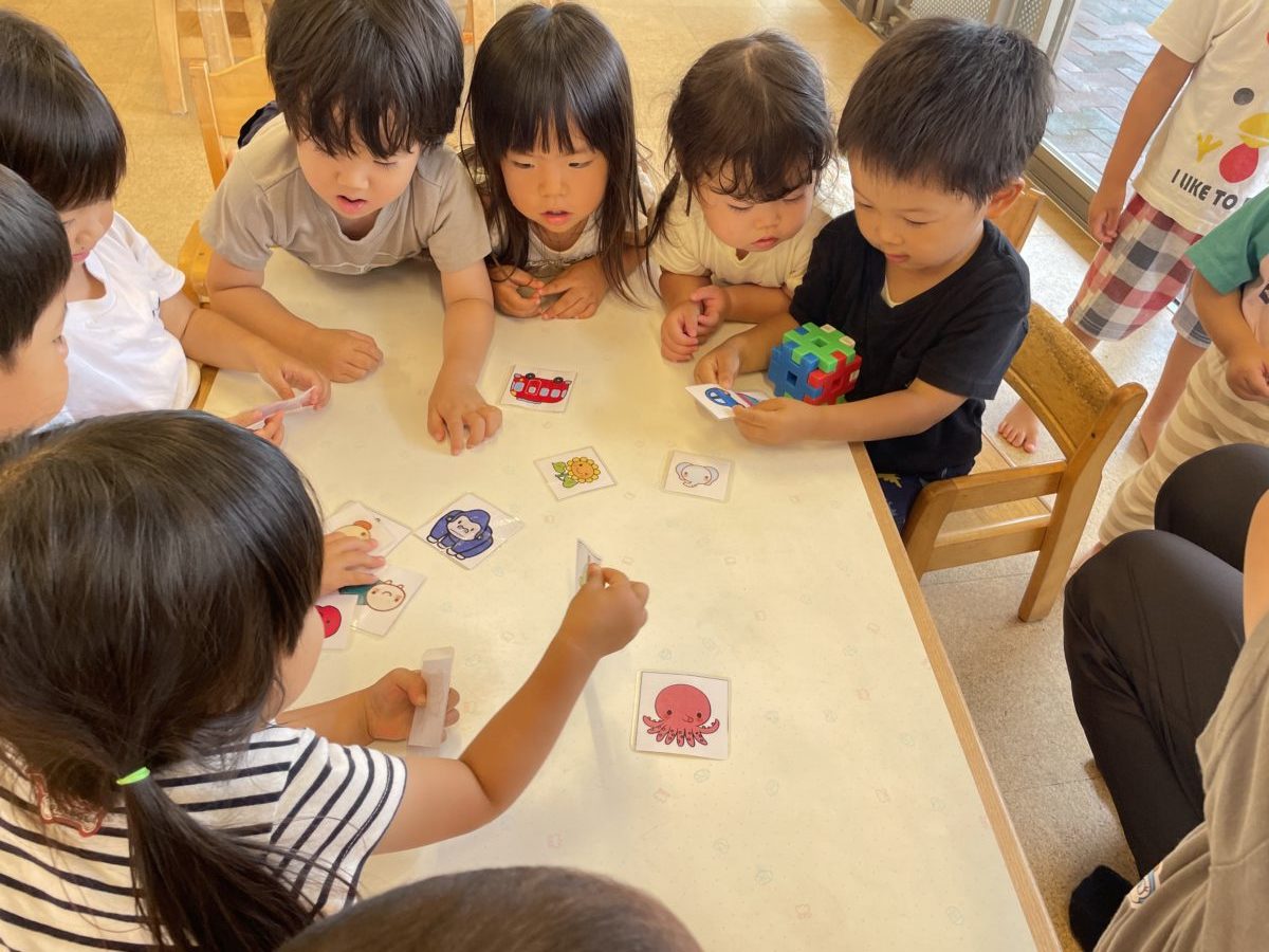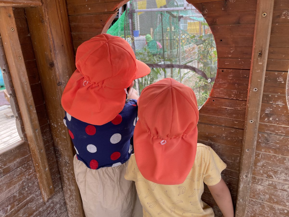 他にも園庭から見える畑にお野菜がなっているのを見るのが楽しみの子ども達。丸い窓から覗くと見えるお野菜に大興奮!今日はナスが出来ているのを発見すると、「見て―!ナス!」「なんこあるかな?」「いーちー、にいーい、さん。3個あるよ!」と見える位置からのナスの数も数えていて、毎日出来上がる野菜を心待ちにしている姿が見られ、その姿は可愛らしかったです。