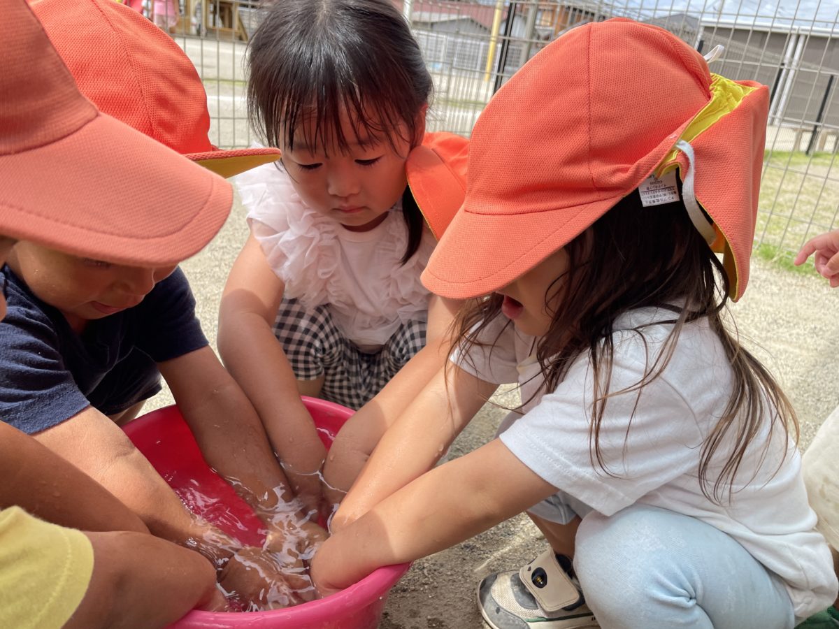 今日は風が少し心地よく過ごしやすい気候でした。子ども達も元気いっぱいで、園庭をかけっこしたりしていました。バケツにいっぱいのお水を汲み、園庭の真ん中に置いておくと、「きもちいね~!」とお水の中に手を入れて、触っていたお友だち。そのうち、そのお水を手の平に汲み、遠くに飛ばしてみたり、手に付いているお水のしずくを眺めたりと様々な楽しみ方をしました。最終はお水を激しく下に零してしまい、泥のが出来上がると子ども達大喜び!手の平いっぱいに泥を持ったりと感触を楽しんでました。その土を使ってお団子を作っていると「○○ちゃんもおだんごつくる~。」「○○も作るよー!」と同じようにお団子作りスタート!中々丸くならないお団子に「おだんご作れるかな?」と話していたり、湿った土を丸めて、乾いた土をひたすら掛けているのを見て、「白い砂いるの?」と同じように乾いた土を泥団子にかけて、団子作りを楽しみました。「でか!先生のお団子大きいな~!手伝ったろ!」と子ども達と一緒に作ったおあ団子は最終的に磨いていくとピカピカ団子が出来上がったので、「ピカピカやな!すごいな!」「さわっていい?」「つるつる~!」と触って観察してと、お団子作りを最後で楽しみました。子ども達の作ったお団子もハンバーグみたいに出来上がり、ベンチに置いたりしてあって、お店屋さんなどもして楽しんでいました。