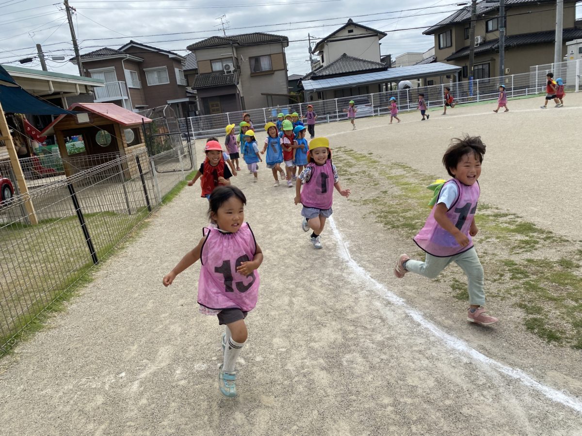 みんなでトラックを走ったりしながら音楽が止まるとストップ!!で体を動かして楽しみました。止まる瞬間にはおっとっとっと・・・と速く止まろうと頑張っていました。