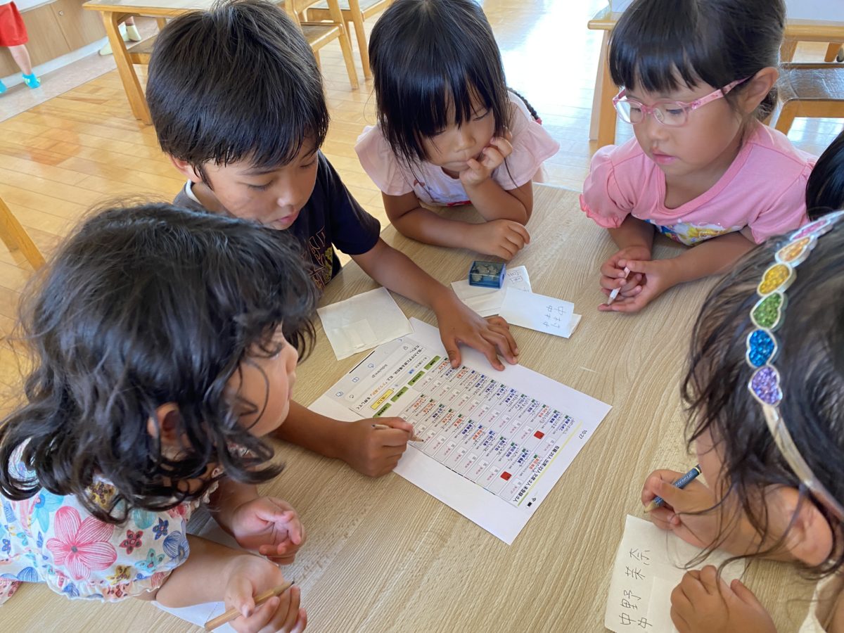 めろん組さんの名前を漢字で表した表を用意してみると「これはだれ!?」「かいてみたい!」「わたしのもおしえて!」とばなな組さんやさくらんぼ組さんのお友だちも集まってきていました。