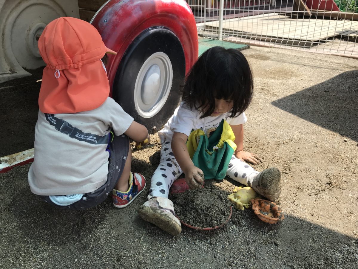 園庭で砂遊びをしていたお友だちはお皿いっぱいに砂を入れて「いっぱいだね」と話したり、「これねアイスクリーム!」とアイスクリームを作ったり、ケーキを作ったり、色々な食べ物を作ってやり取りを楽しんでいました。また、近くにある石などを見つけると、上にのせてトッピングにしてみたり、色々な料理を想像しながら作り上げる様子がありました。