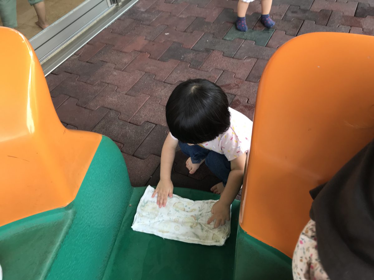 テラスに出ると園庭にある水たまりを見つけて「あめのせい!」と水たまりを指さして「雨降ったね~」と雨についてお友だちと話していると、フラワーカップが濡れていることに気づき、「ぬれとるな~」「ふきふきする!」と雑巾を持って拭いてくれる姿がありました。
