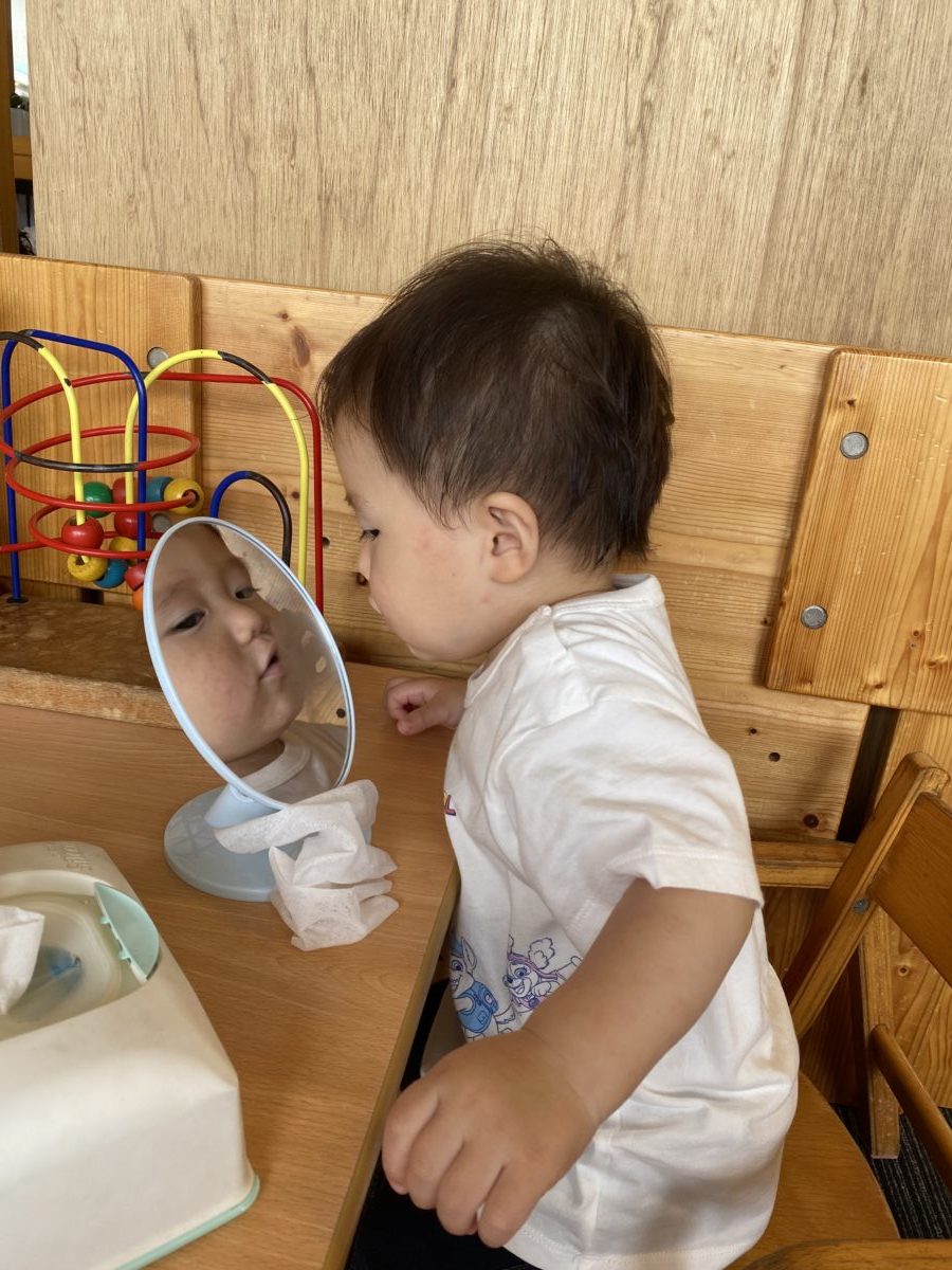 鏡を見ながらお口拭けるかな?鏡を見て一生懸命拭いていました。