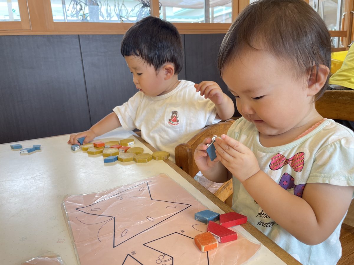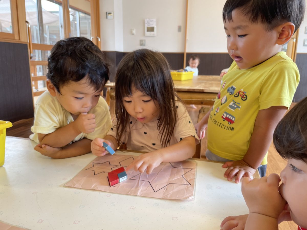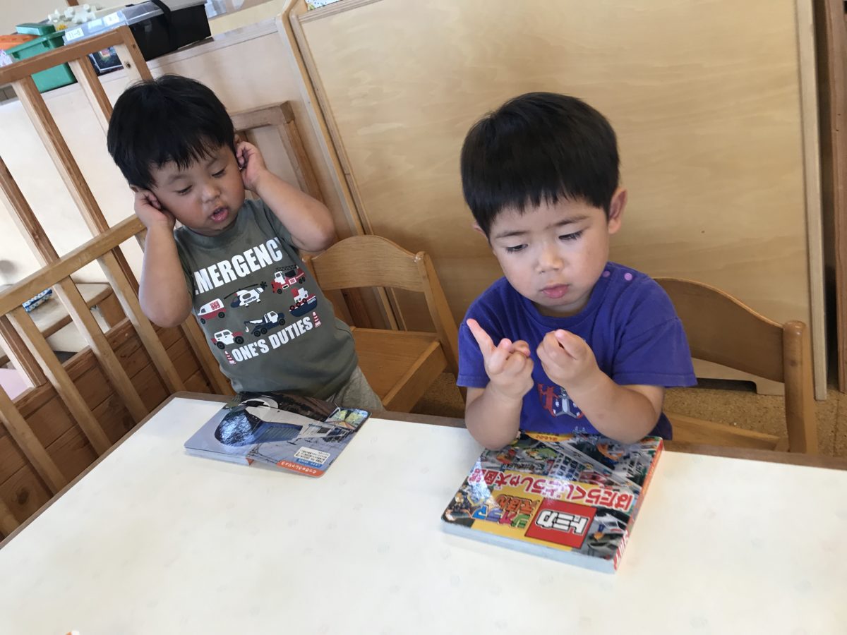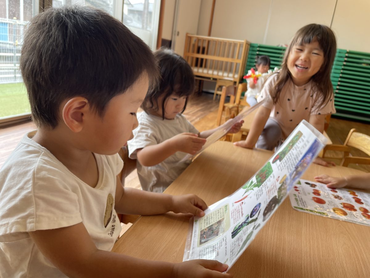 先日畑の野菜や、野菜販売の野菜に興味津々のお友だちが居たので、今日は野菜の資料をいくつか用意しました。その中で子ども達の会話がとても面白かったので載せさせて頂きたいと思います。「○○ちゃん、パパと一緒に大きなトマト抜いたん!」「トマトは葉っぱの所は取るの!」「これ赤いトマト!こっちは黒いトマト?」「こっちと交換しよーう!」「これ唐辛子?」「唐辛子って辛いから食べられないんやで!」「お口入ったら辛い辛いってなるよ!」と次々と資料を見ながら繰り出されれる会話の数々がとても面白くずっと観察をしてしまいました。他にも動物カードを用意すると「これだーれだ!」と言いながらカードを見せると「ぞうさん!」と知っている動物は名前を出し、分からない動物は「これはだれや?」「こんな顔しとんで!」と写真の真似をしたりしながら遊びました。また動物の特徴が難しい時は「お顔はどこ?」「きもちわるいね!」等自分の感想を言ったりする姿もあり、自分の意見や思いを言葉にして楽しんでました。カードは動物名が出てきたお友だちに渡すと嬉しそうに受け取り、最終「何枚ある?」と聞くと「いーち、にいーい、さーん、しいーい、いーち・・・。」と枚数を数えようとする姿が。また4まで数えると、また1に戻ってはいましたが、最後の一枚を数え終わると、「あれ?」と不思議そうにしていたのがとても可愛らしかったです。その他の場面でも絵本に載っている電車を数えるのに手の本数を出しながら数を数えていたりして、自分で考えようとする姿が合って感心しました。そんな頼もしいりんご組のお友だちがしていることに憧れを持っているのか、いちご組のお友だちもりんご組さんのしていることを真似たりしながら一緒に色々なことに取り組む姿があって、とても感心しました。