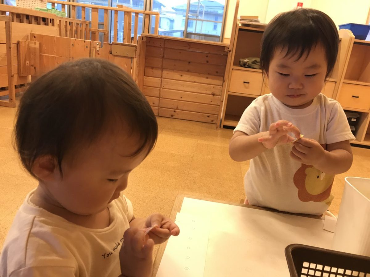 シール貼りでは、印を書いてみたものと無地の紙と二種類用意し、ランダムに貼っていく姿や印の上にぴったり貼る姿など様々な姿がありました。剥がした台紙をゴミ箱にきちんと入れる姿も見られました。お兄さんお姉さんたちがおたより帳にシールを貼っていく姿を興味深く見ている姿もあるので興味を持った時に挑戦していけるようにしたいなと感じました。
