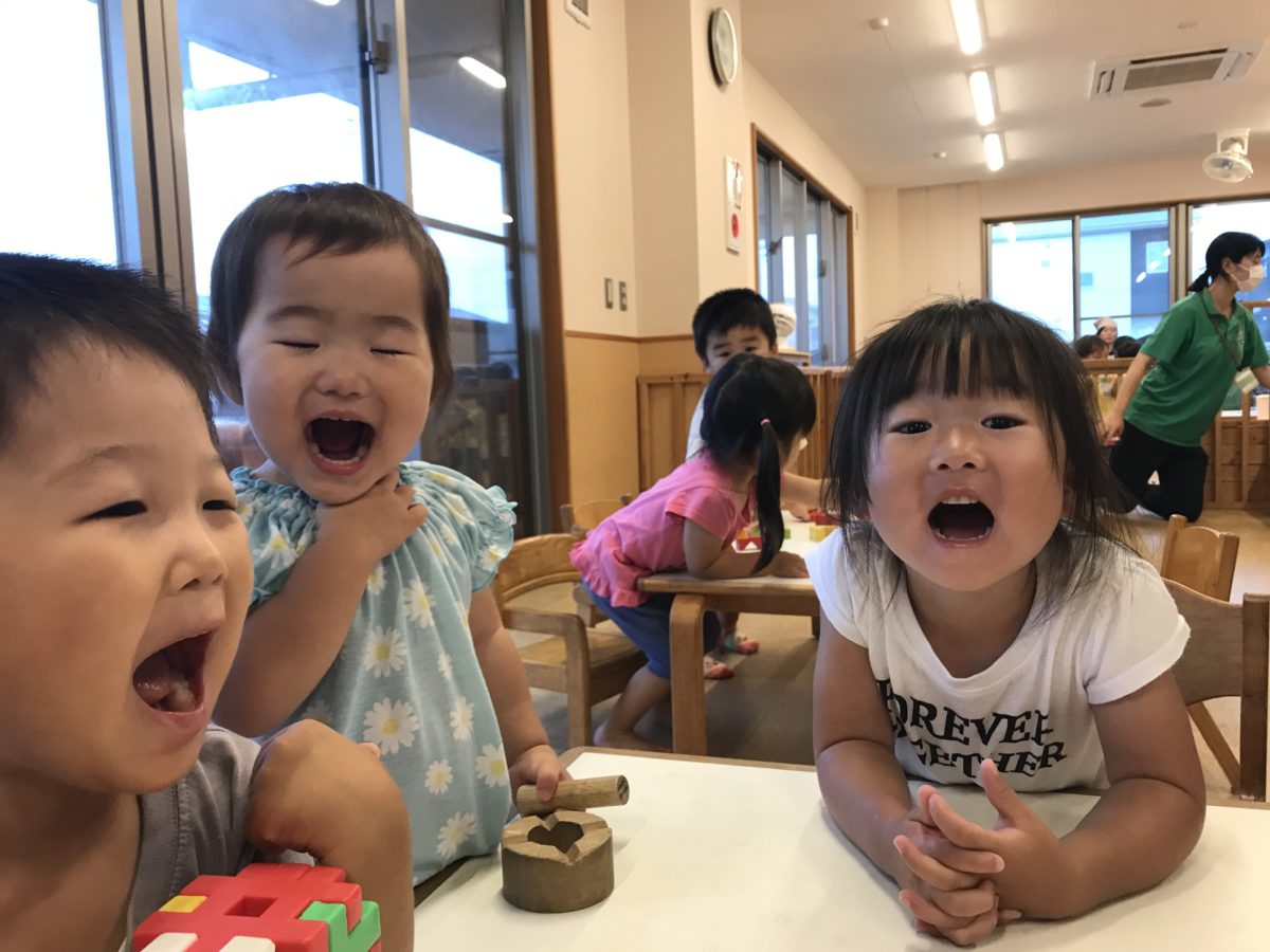 「ねこざかな」の絵本を見ていて大きな口を開けるシーンで子どもたちも真似して大きな口を開ける姿がありました。